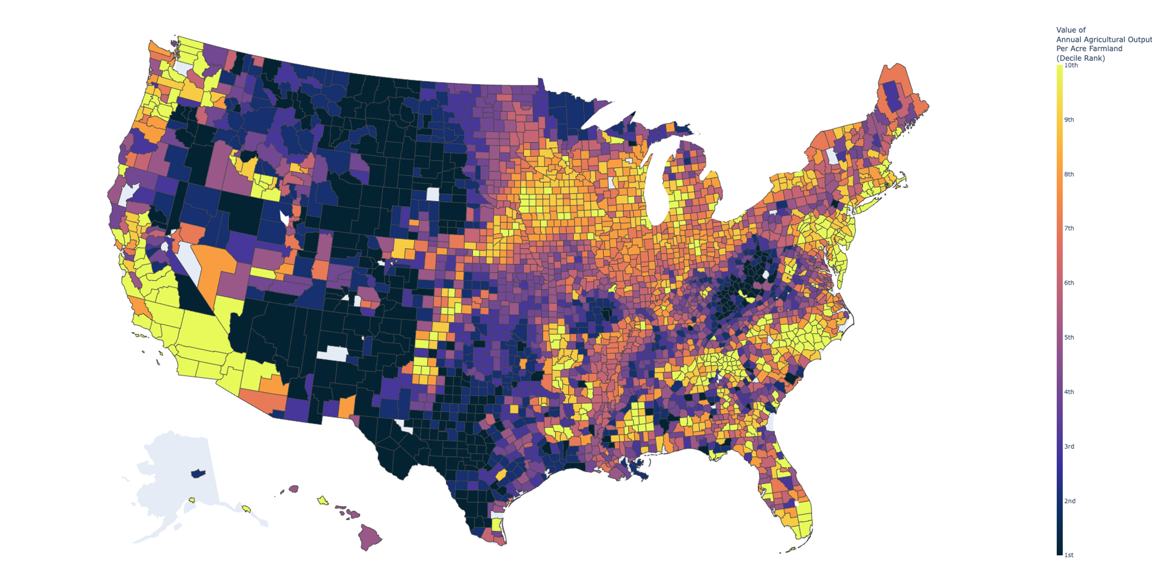 Through mapping these ratios, we can identify counties where the value of the land’s expected agricultural output is high relative to its cost—in essence, where you can get the biggest bang for your buck if all you care about is profitable farming.