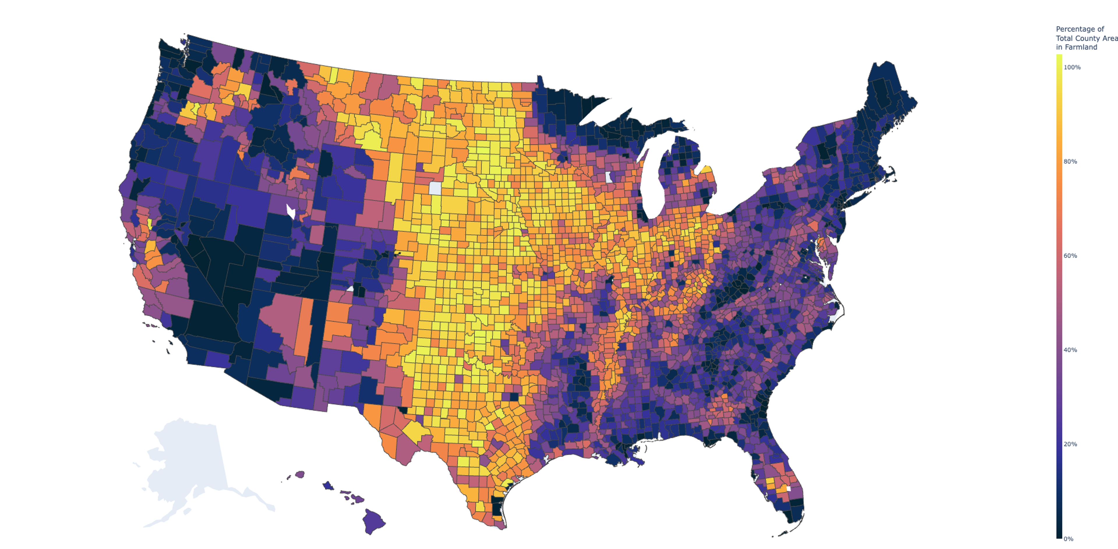 We mapped all the farmland in the US by its ratio of land cost to expected agricultural value.