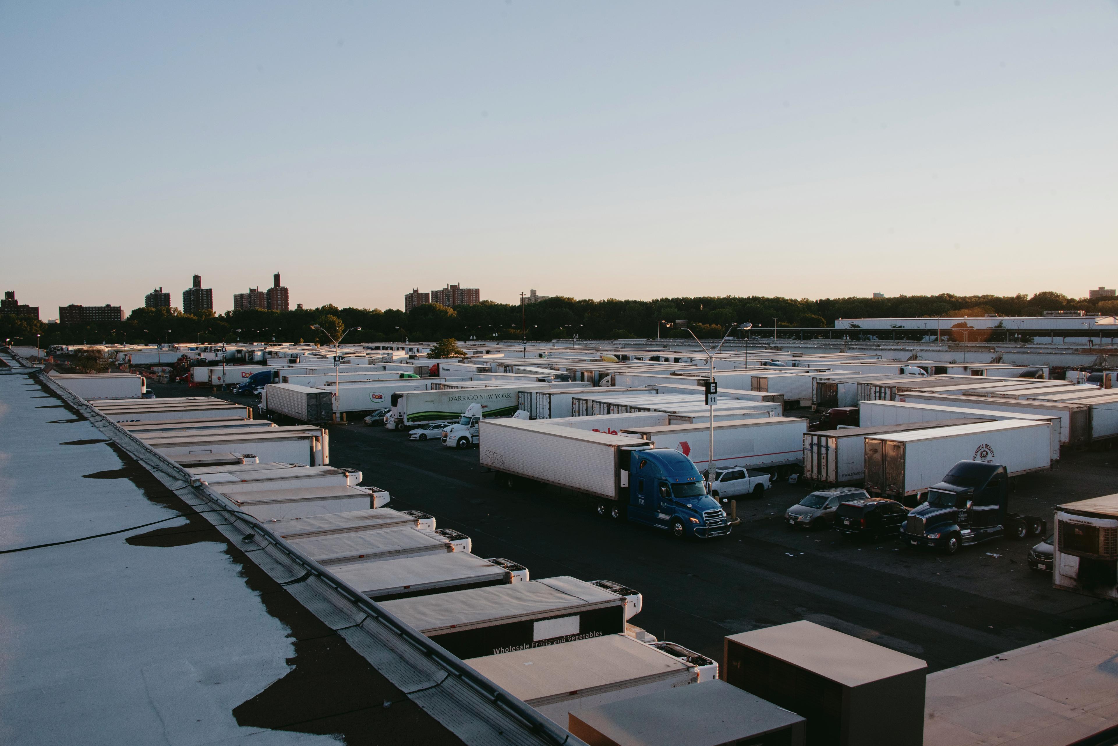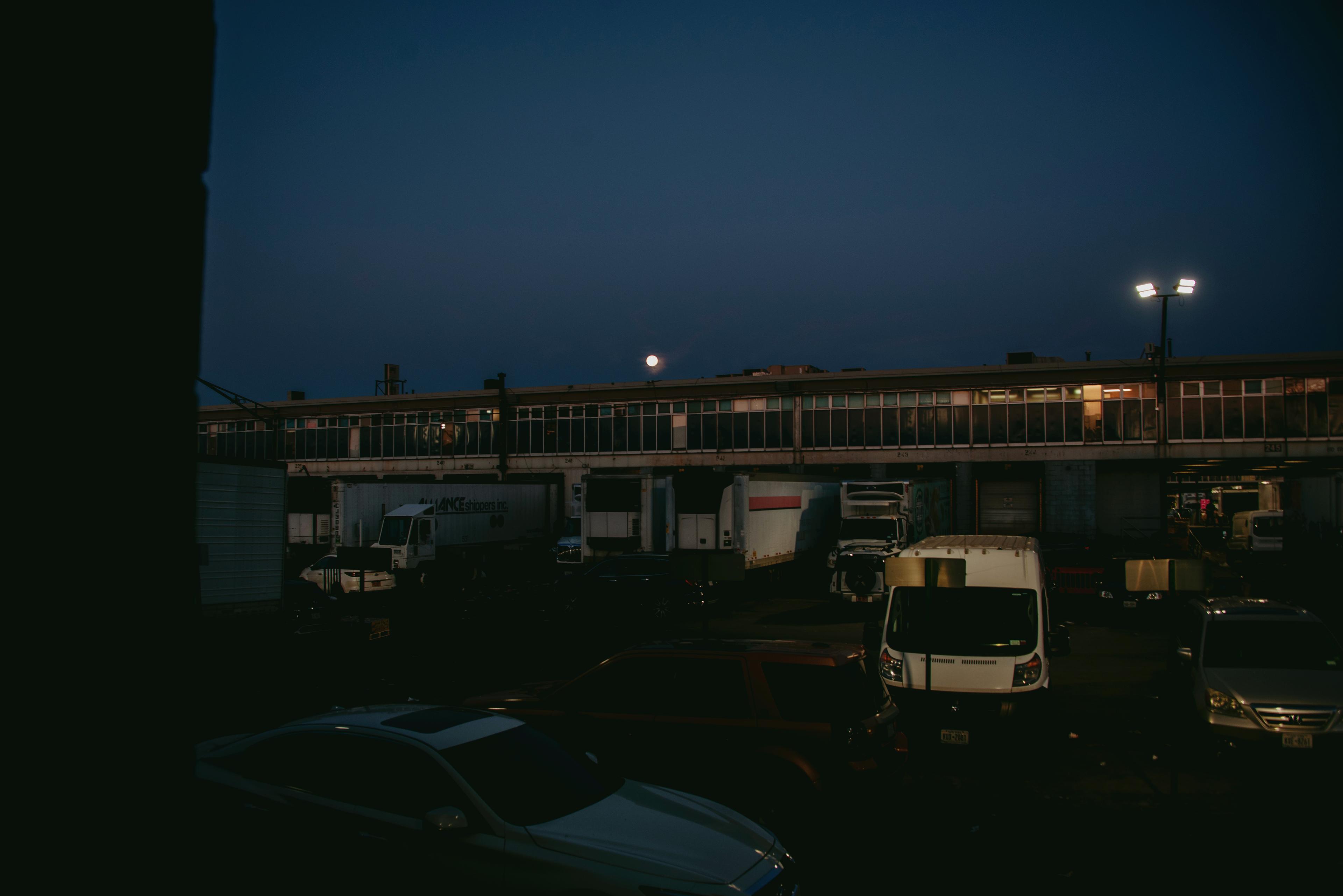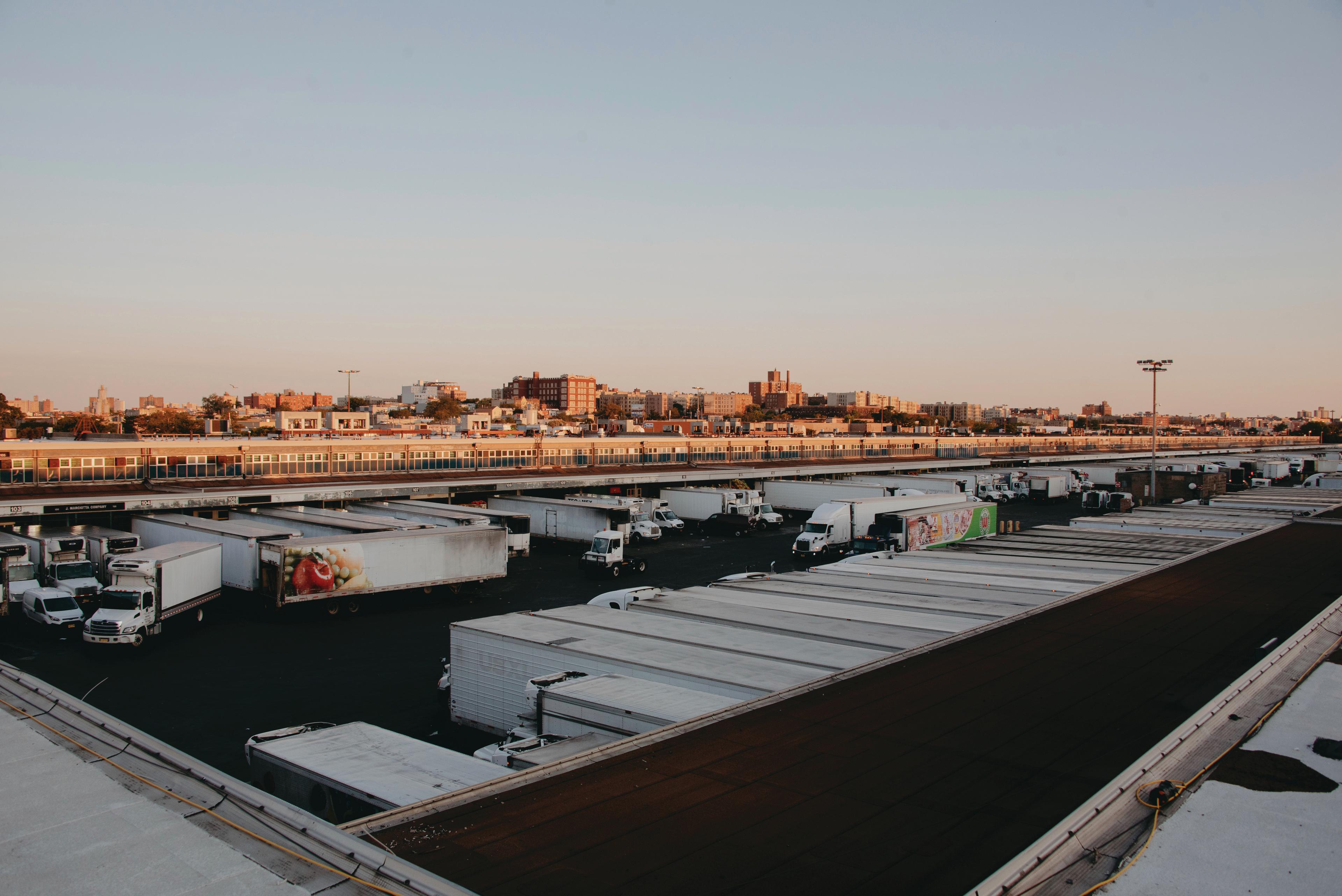 Trailers line the decks of the New York Terminal Produce Market at dawn, the end of the market day.