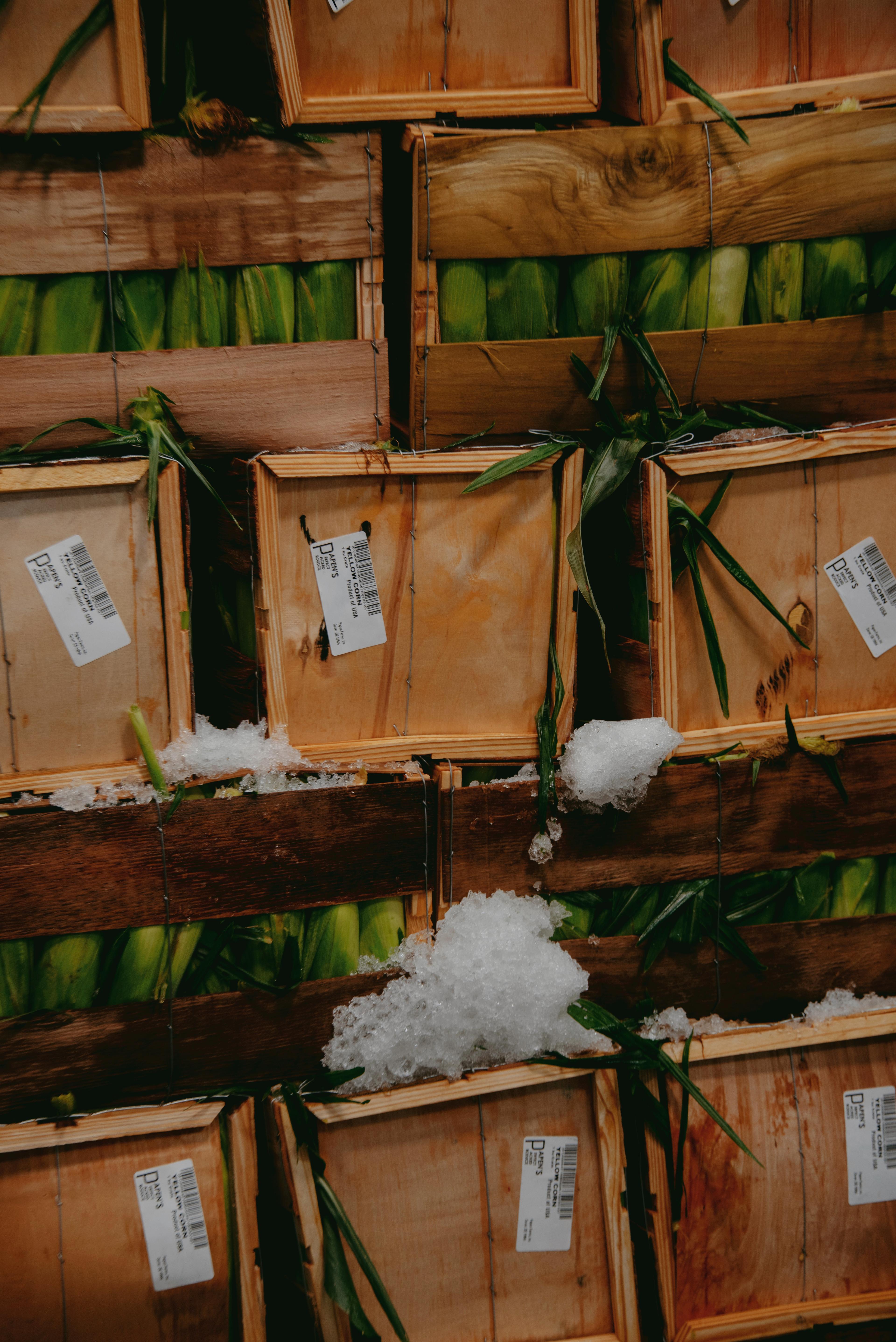 A variety of packaged produce waits for a forklift to transfer it to its next destination. (R) Crates of fresh corn leave a trail of crushed ice as they are transferred from the trailer of an 18-wheeler to cold storage.