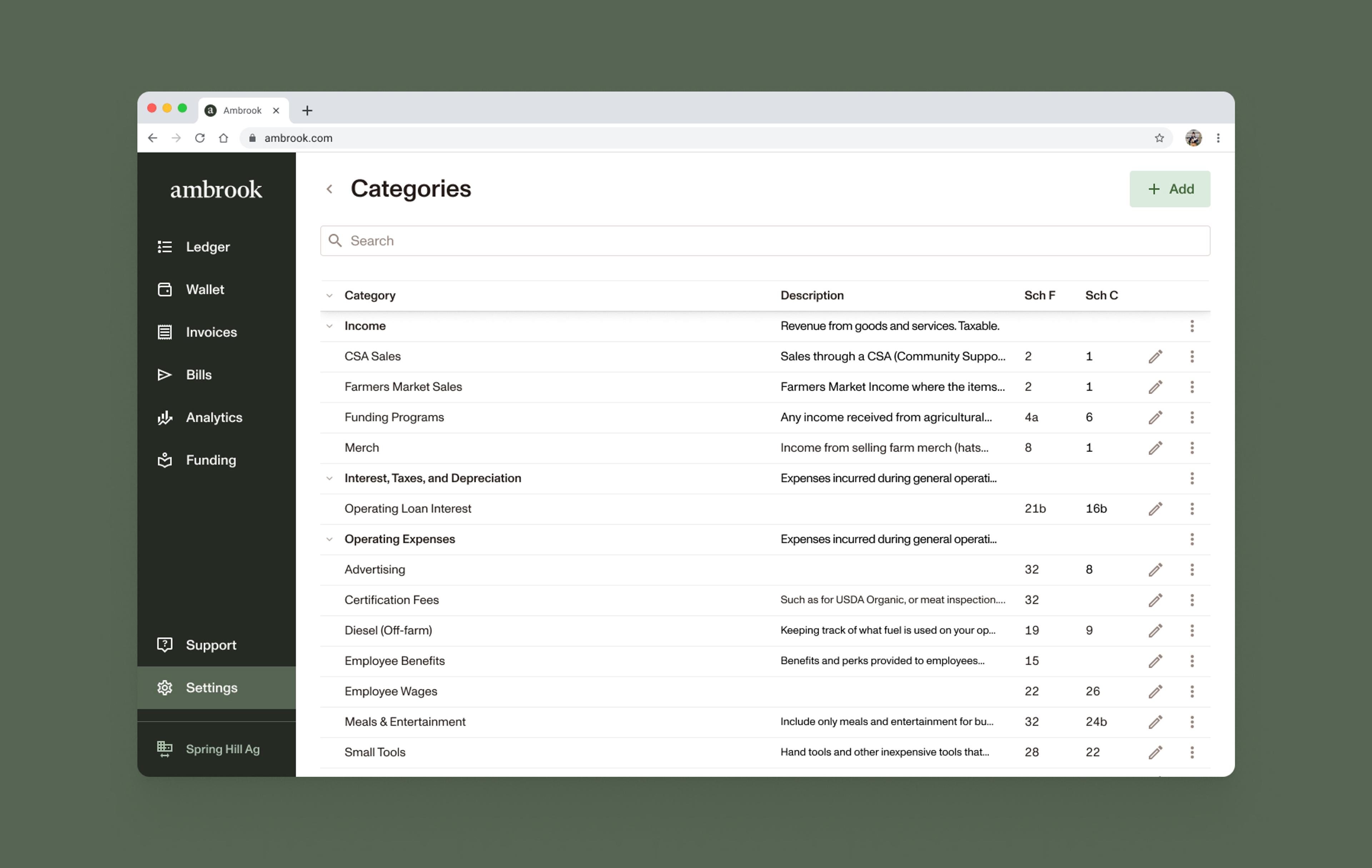 Ambrook makes farm accounting accessible for all and it starts with a foolproof set of tags that connect back to tax forms such as the Schedule F. When a farmer joins Ambrook, our team works with them to refactor their Chart of Accounts into a plain-language format that breeds confidence and financial accuracy.
