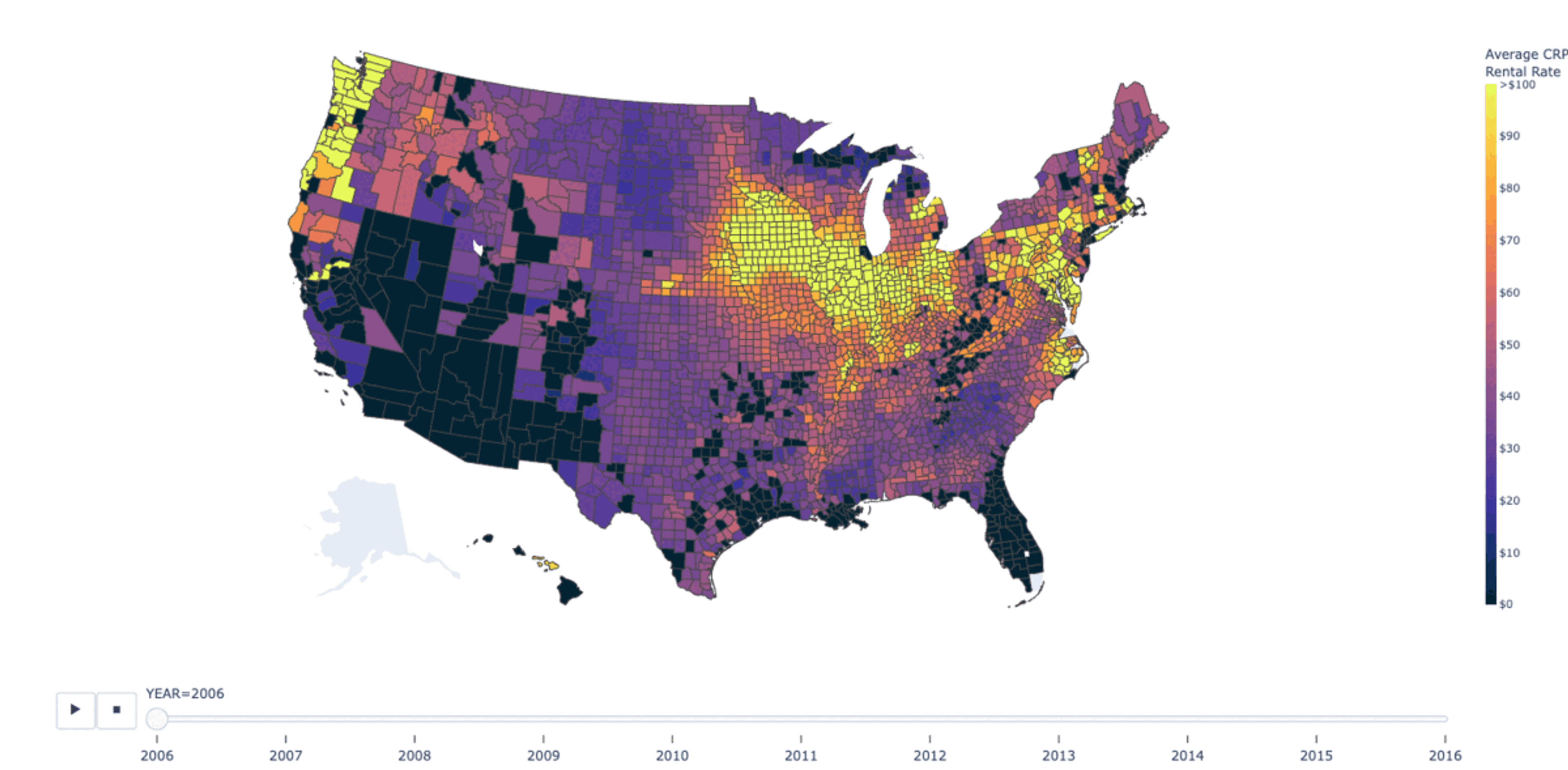 The Conservation Reserve Program was created as a result of The Food Security Act of 1985. CRP participants cease agricultural production on portions of their land that have been deemed “environmentally sensitive” in exchange for rental payments from the government. Halting this production is meant to aid in the recovery of soil health, water quality, erosion, and wildlife habitats. CRP expanded from a limited application window now known as the “General sign-up period”, and has added an additional “Continuous enrollment period” for land that is particularly important for certain environmental concerns. This analysis includes acreage from both the General and Continuous CRP sign-up periods.
