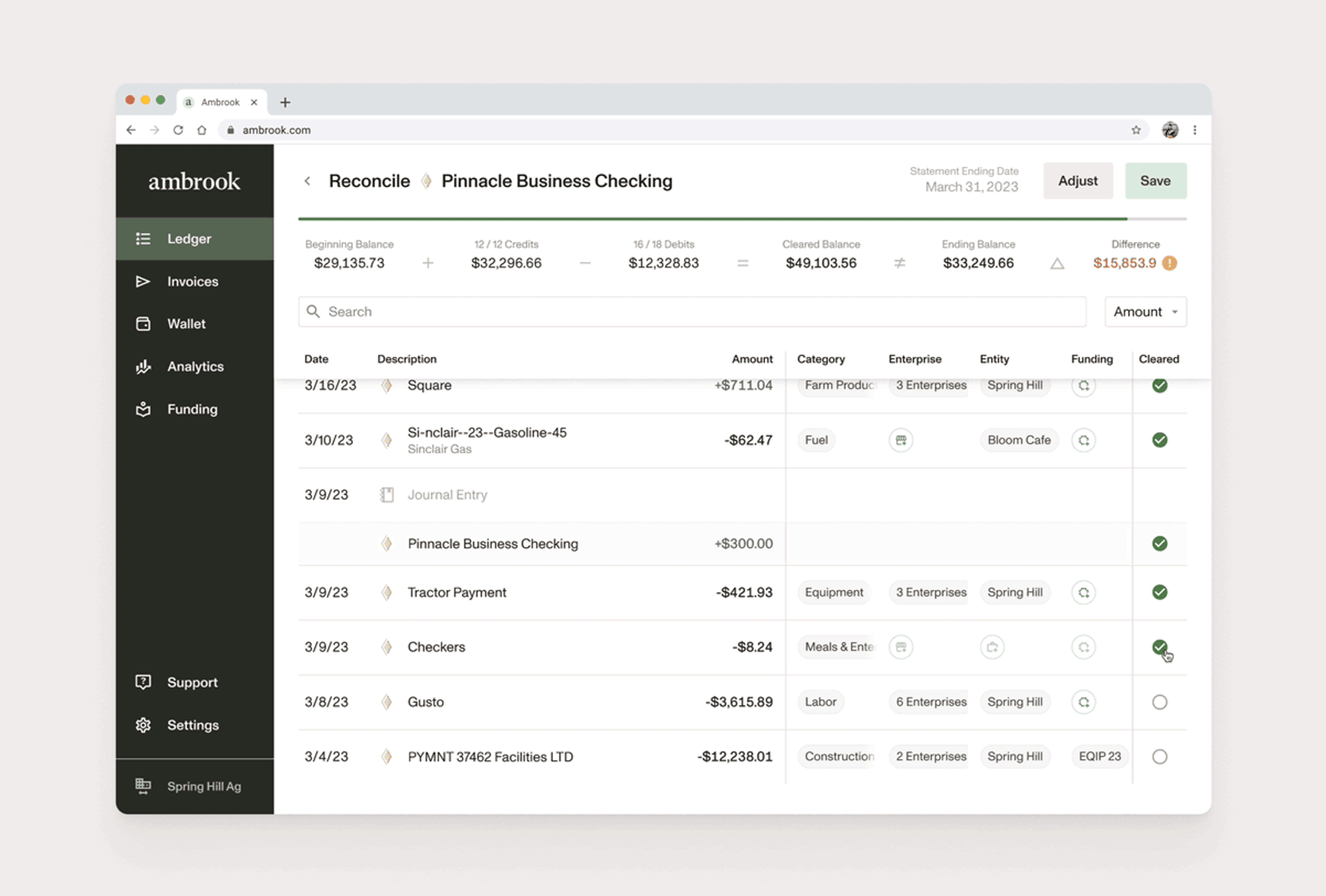 Ambrook’s reconciliation function makes comparing your ledger and your bank statements quick and painless. It’s also purpose-built for farm accounting, making it easy to categorize and track personal and business expenses while giving you unparalleled insight into your operation’s performance.