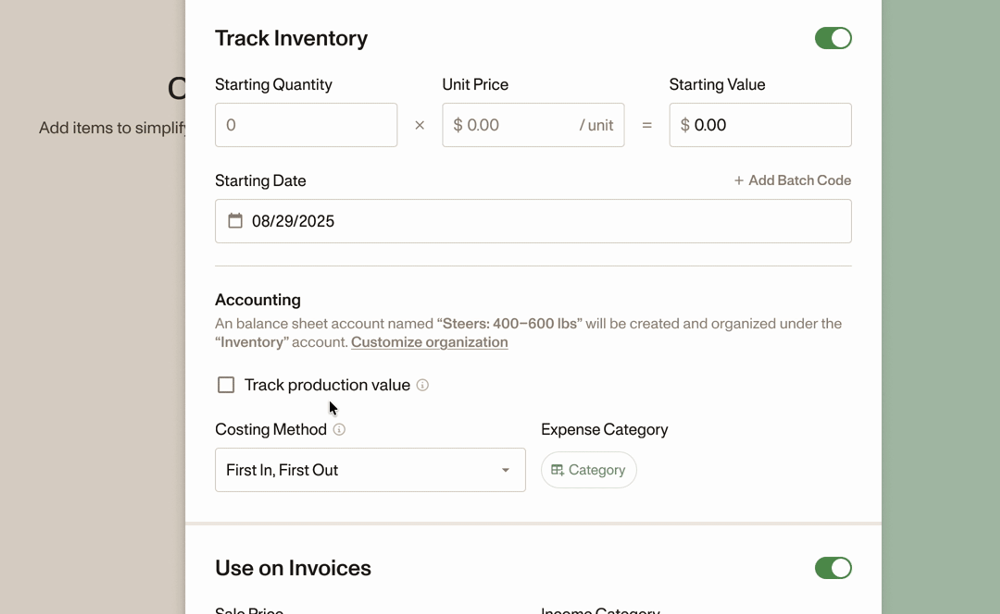 Critically, for anything Josh produces himself—like calves born on the operation or hay he puts up—he marks it as self-produced. That tells Ambrook the item wasn’t purchased from a vendor; it came off his ranch, and its value should be tracked accordingly.