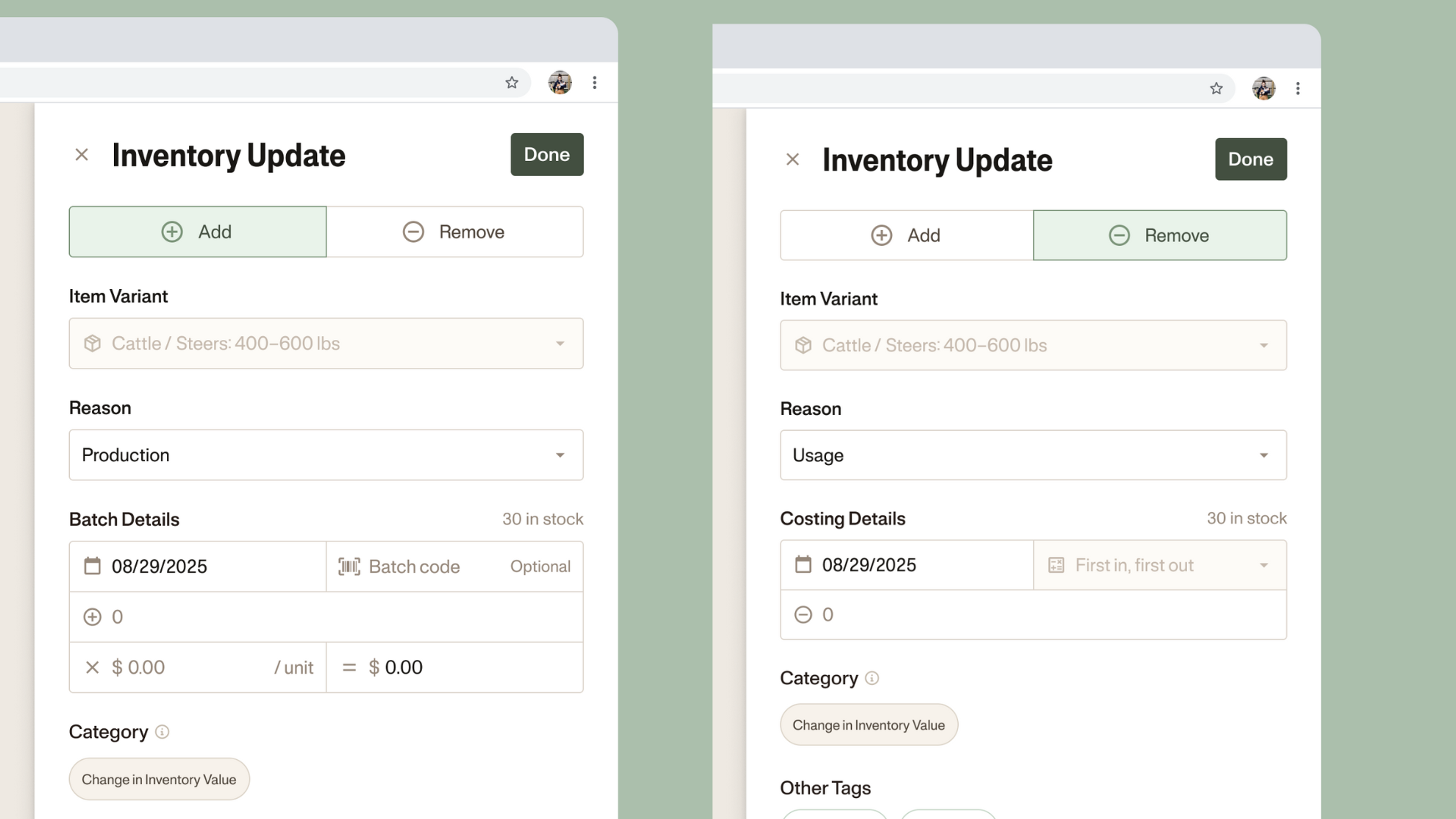 “Every time we get a load of commodity in, we just add that to the inventory,” Josh explains. Feed purchases flow into Ambrook through bills. As feed is mixed and delivered, inventory quantities are reduced to reflect usage. For events that aren't tied to a transaction—births, death loss, sales—he records an inventory change directly. Enter the quantity and reason, and Ambrook assigns or removes value accordingly.