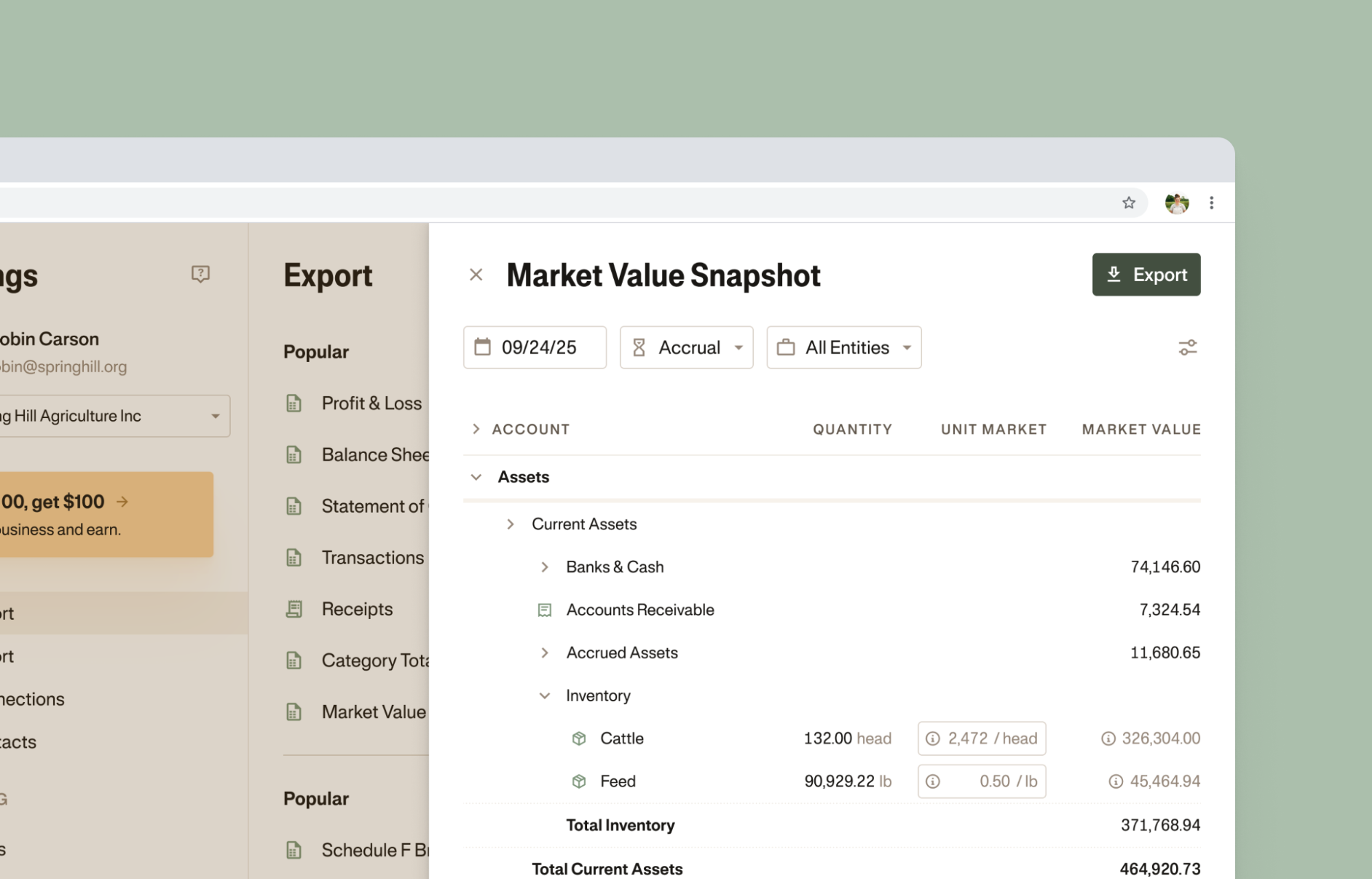 Now, his balance sheet shows the full picture: inventory listed as assets, valued at cost—or updated to market value for lender conversations. His P&L reflects true production costs, with feed expenses recognized when cattle sell, not when the corn is purchased. And he can generate a Market Value Balance Sheet that shows what the operation is worth today, not what it cost months ago.