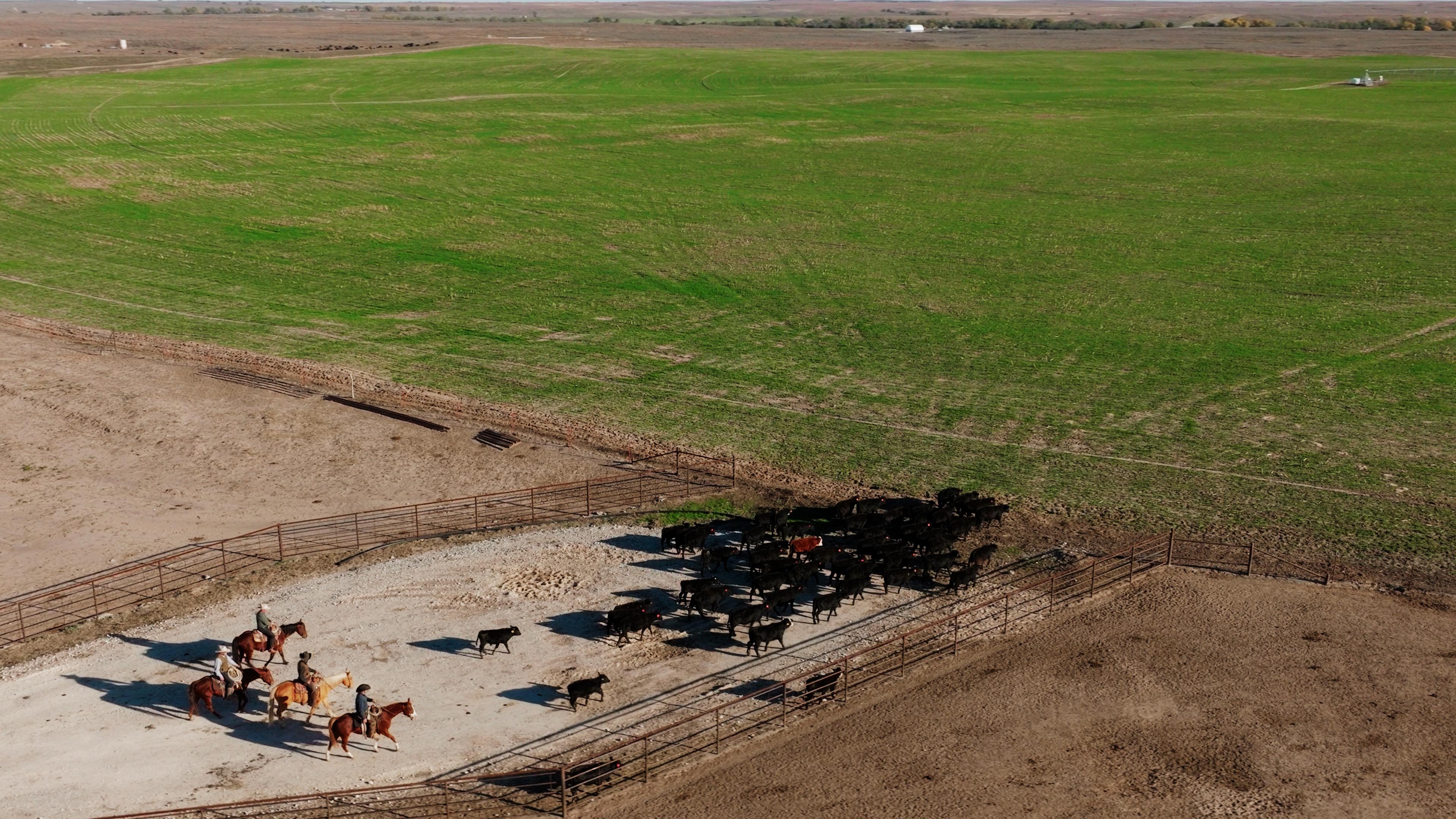 Five riders on horseback guide cattle from the pens out to pasture. Nearby, hay bales disappear into the grinder while tractors idle along the silage pile, iPads mounted in the cabs, logging usage in real time.