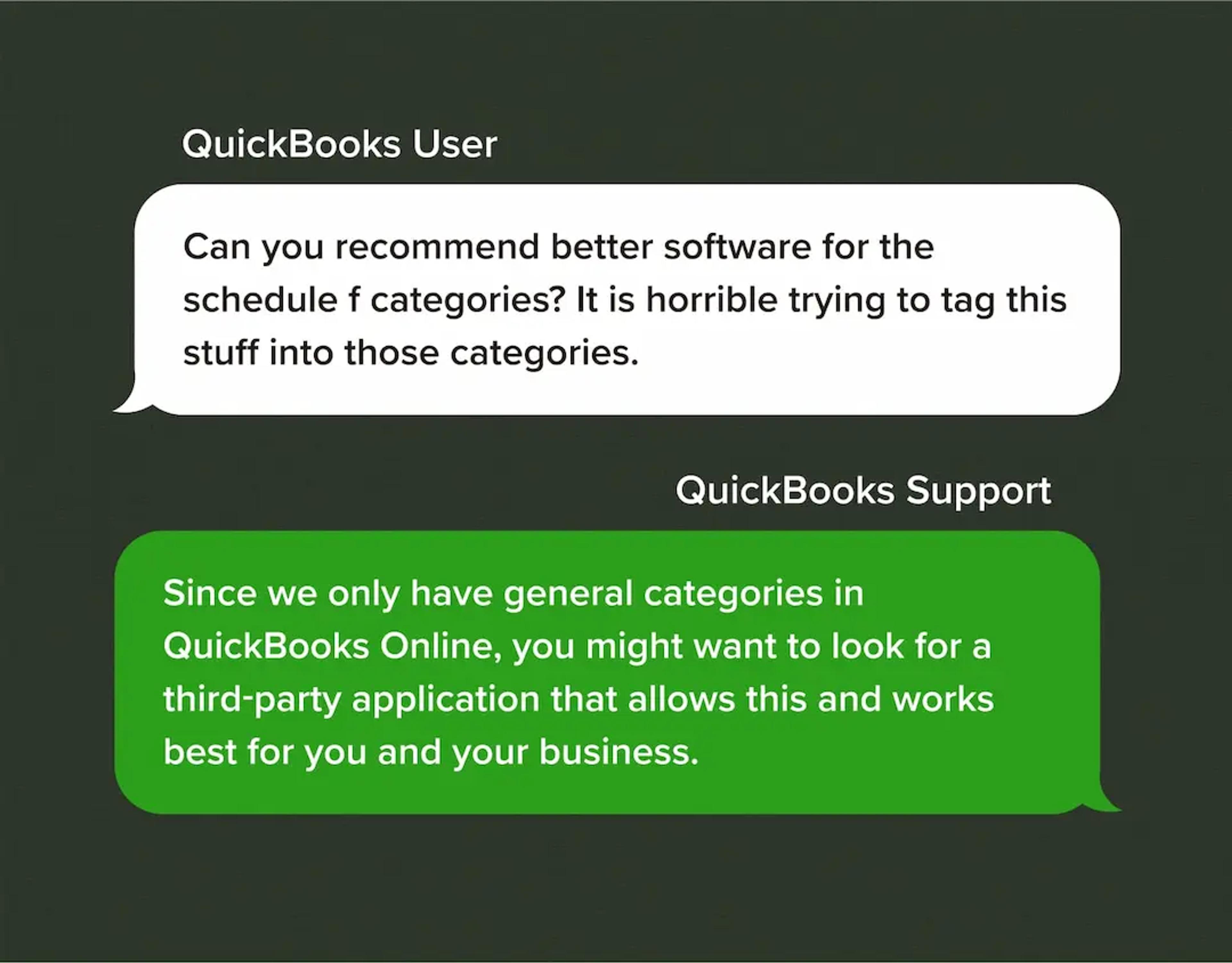 QuickBooks Online is incompatible with ag tax forms and charges you for features you don't need. Ambrook is streamlined with workflows built for industry, like Schedule F classification and enterprise tracking.