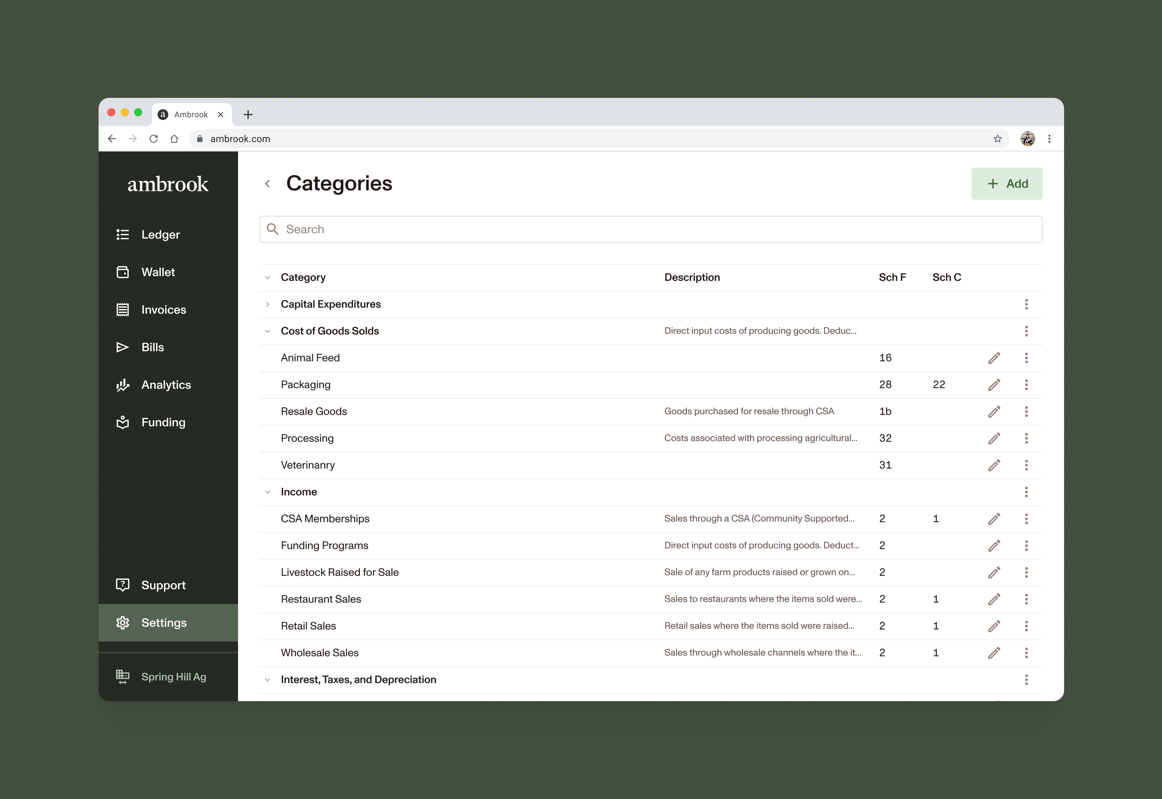 Getting started is simple in Ambrook. Import your existing chart of accounts or use our wizard to generate a template that works for your business. Once you have a first draft, add, remove, nest, and rename at will. Under the hood, each category ties back to the appropriate fields in your tax forms (Schedule F, Schedule C, and more), so there are no nasty transformations and extra hours come April. Prepare your data for your business and for tax season all at once.
