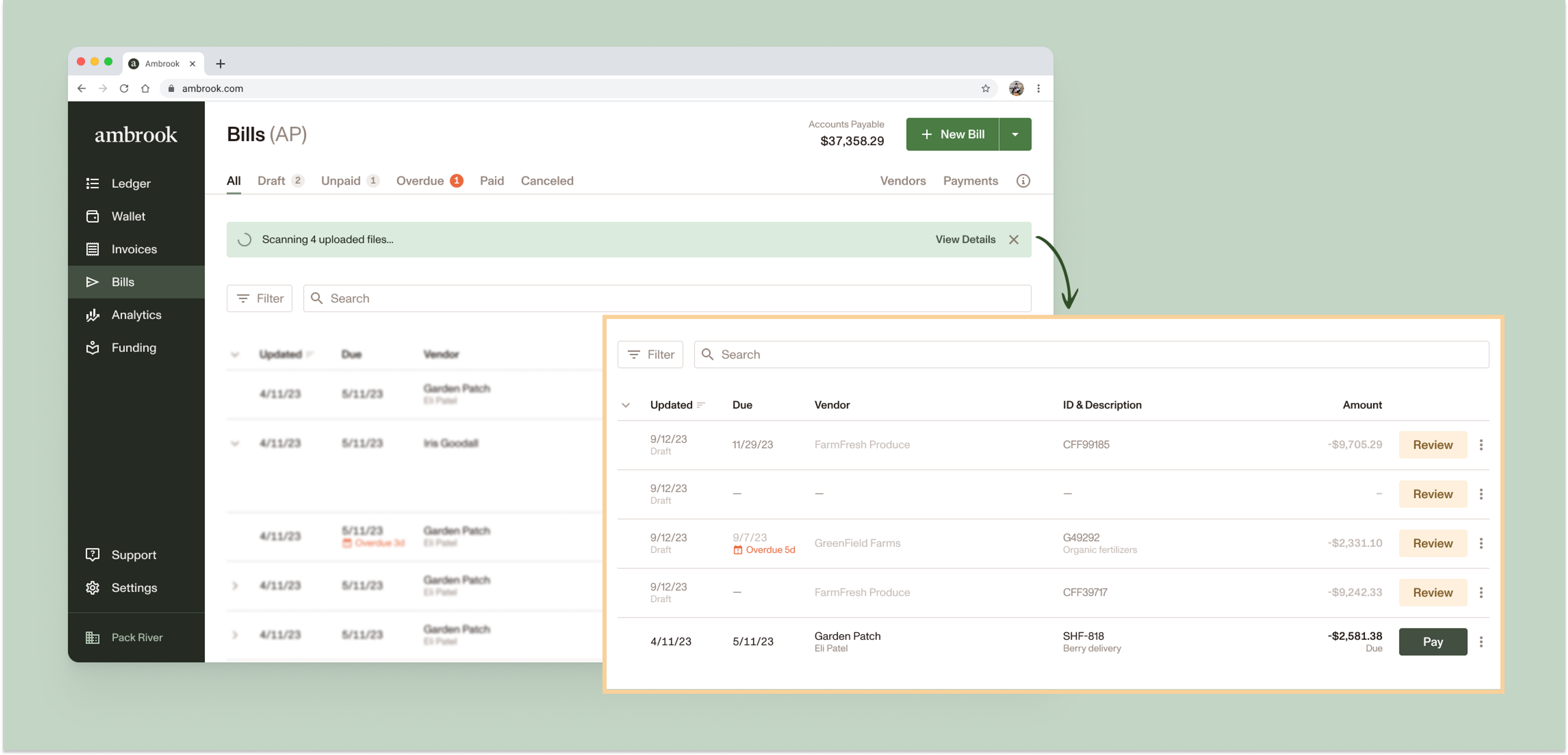You can now create multiple bills and invoices in Ambrook with a single action. Simply drag and drop your files directly into the home screen of the Bills or Invoices tabs. A green bar will indicate that they are being scanned and uploaded, and you can navigate away from this screen to continue your bookkeeping while you wait.