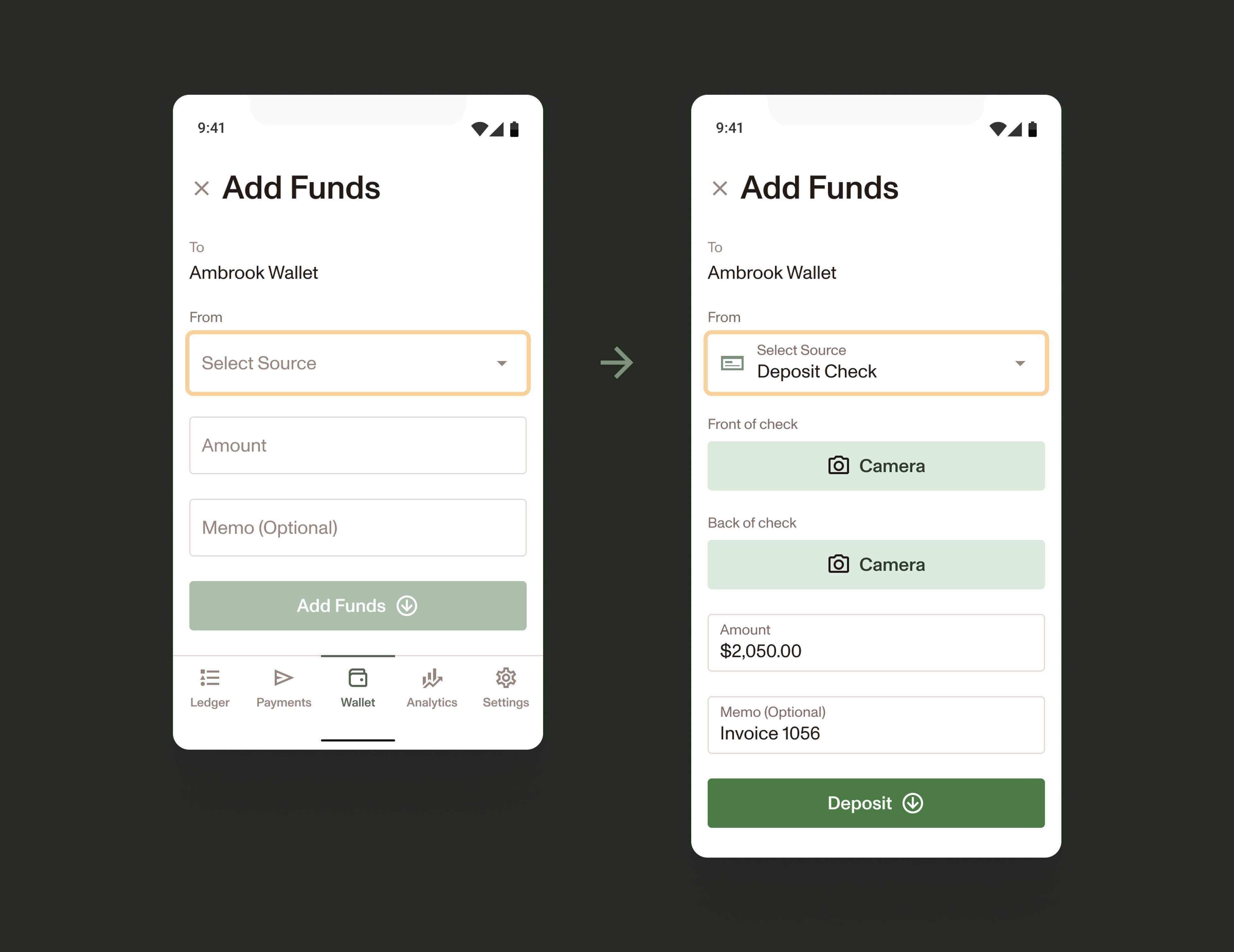 To deposit a check, visit the Wallet tab, click “Add Funds”, and then capture the details of the check. Once submitted and processed, you’ll see the check represented in your Ledger and the funds available in your Wallet.