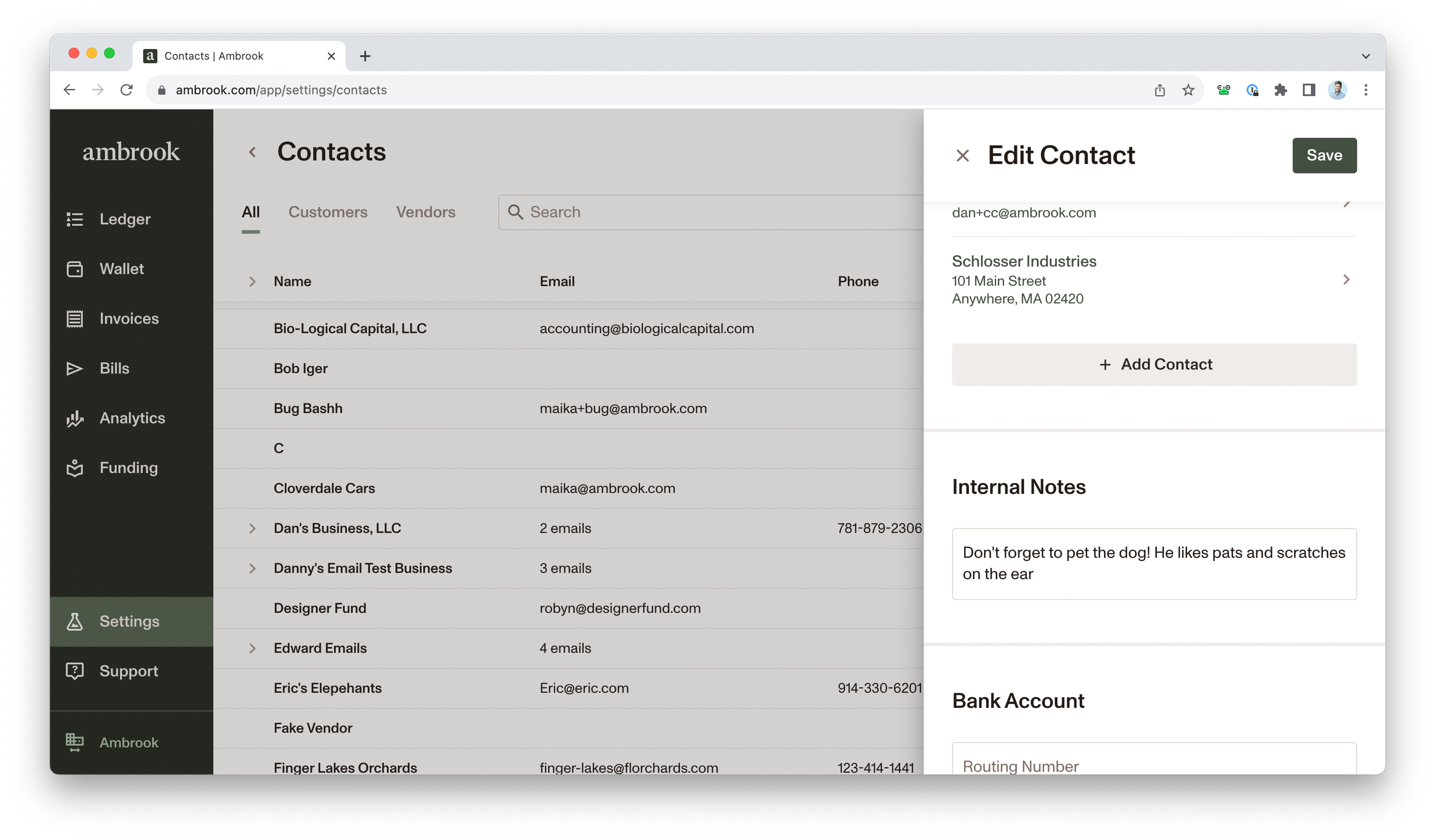 Ali, John, and Dan have also made it easier than ever to manage your contact list and keep track of important information. This includes address info for multiple points of contact, payment instructions, and internal notes. Your lists can be filtered by customers or vendors, and all the information is integrated into the invoice and bill creation process.