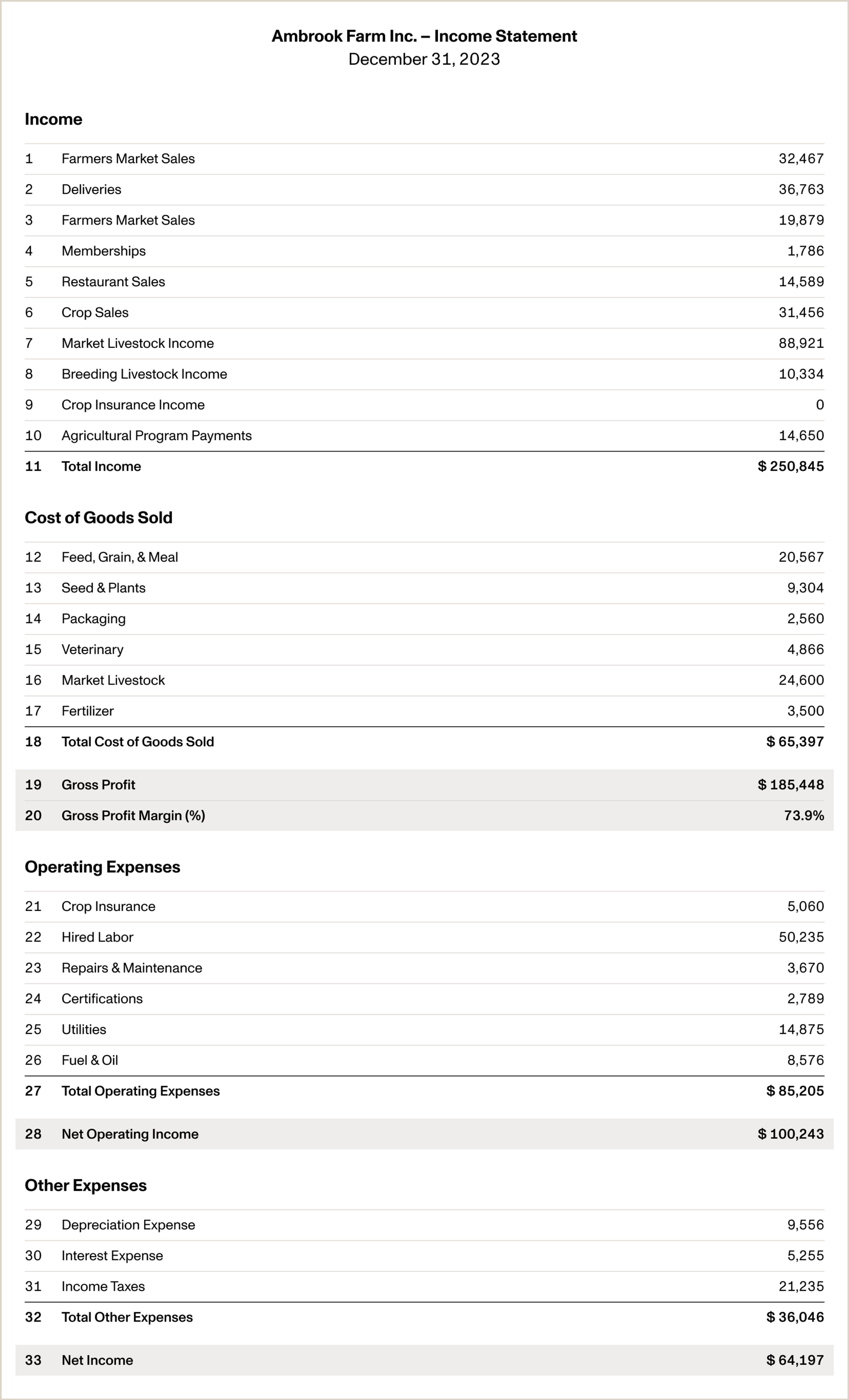 Let’s read through this income statement section by section and see what we can learn about Ambrook Farm’s profitability from each one: