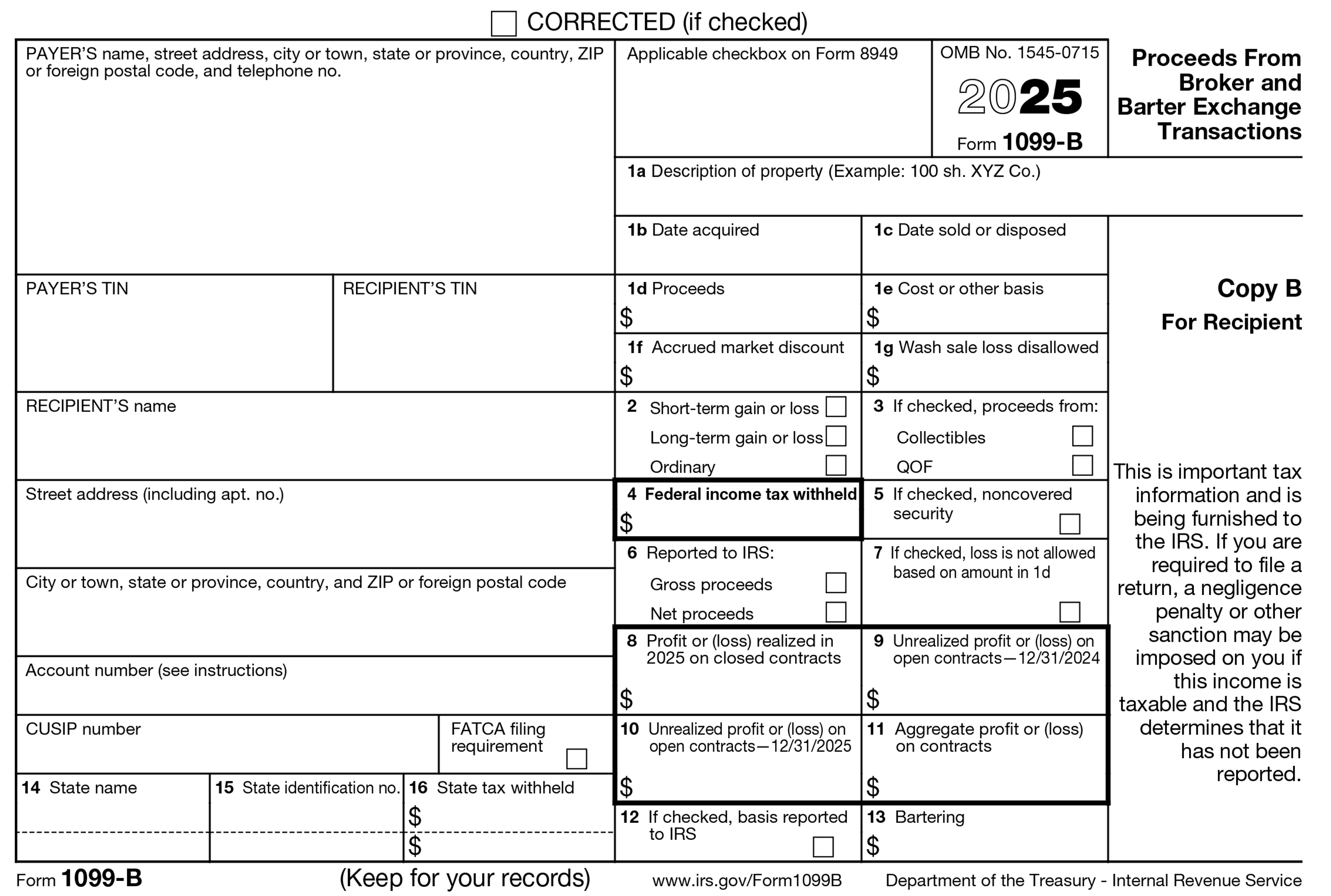 Copy B goes to you. You use it to calculate taxes you owe on gains from trading. You may need to attach a copy to your federal tax return if there is any federal income tax withheld in Box 4.