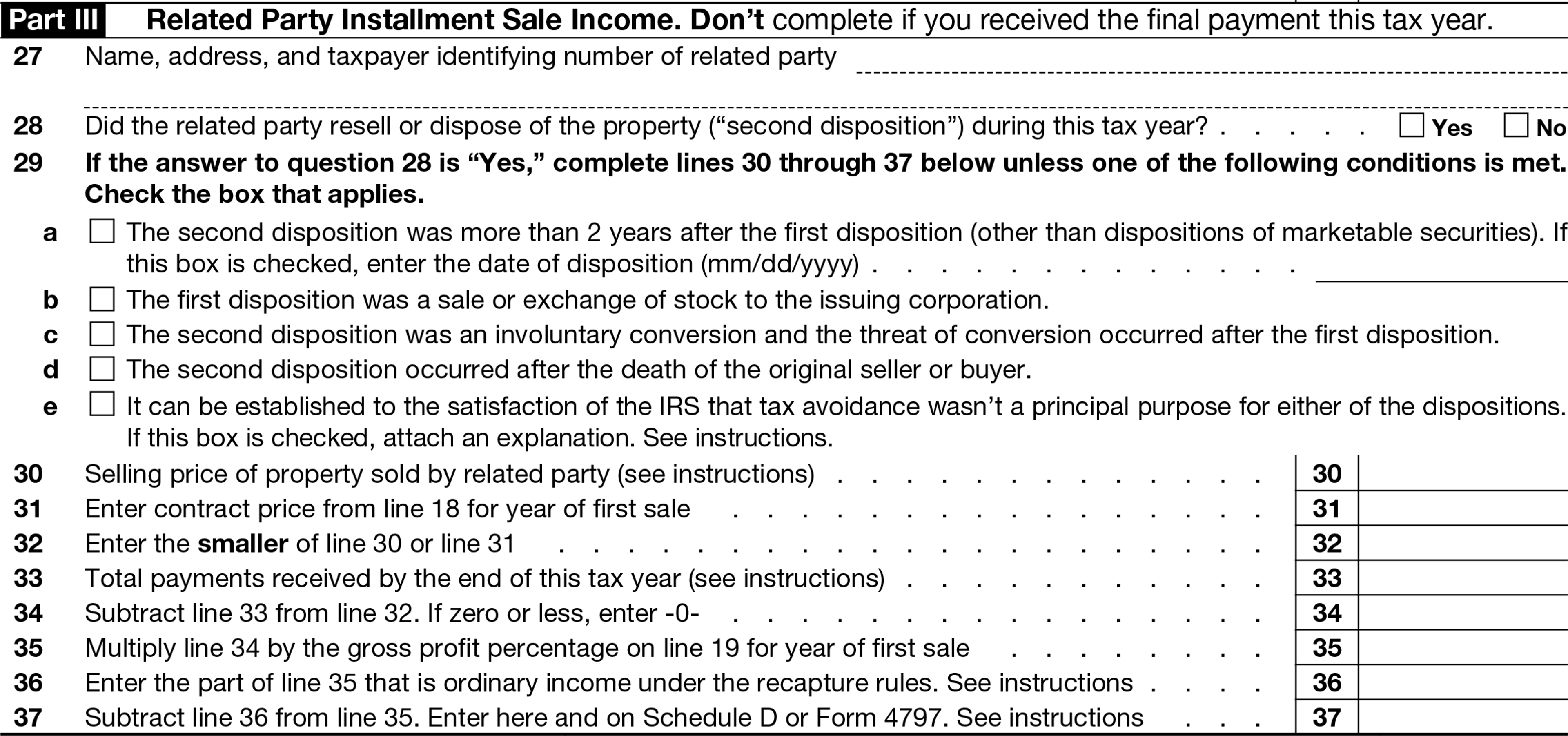 You can find more information on the special rules for related party sales in the Form 6252 instructions or discuss them with your tax advisor.
