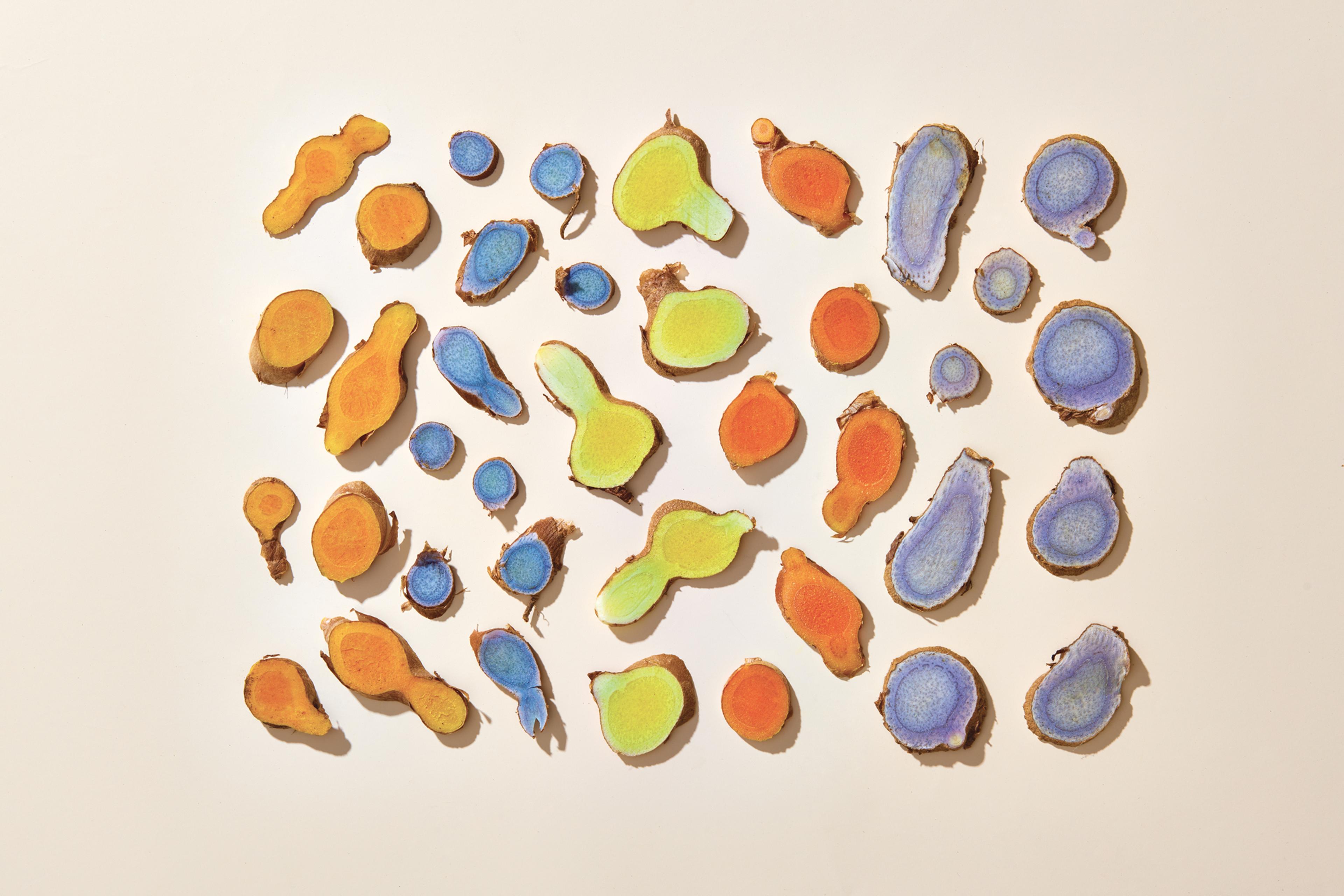 And turmeric is an experience. It comes out of the ground as a quirky, dirt-laden stem that resembles a rock with arms, but when sliced open, a mesmerizing, geode-like interior is revealed. The flesh of the red and yellow varieties bear a squash-like hue, while the more exotic black and blues evoke a watercolor of the night sky. And the green turmeric appears downright radioactive.