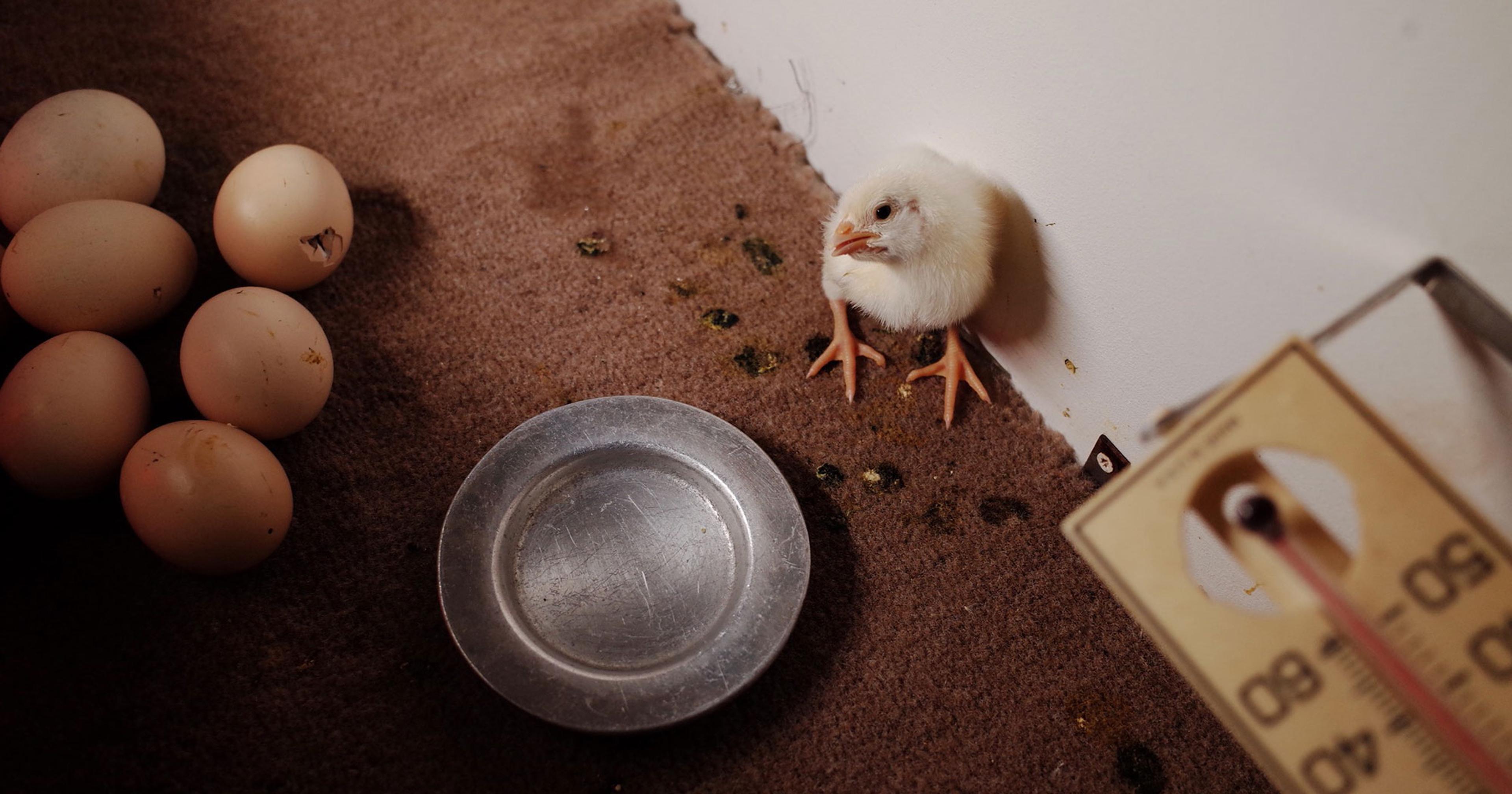The three of us stood around the incubator, watching the chicks chirp and cluster and fall into each other. In the neighboring compartment, a few eggshell fissures expanded, just barely. McGowan was describing how scammers had found his Facebook stream, and were trying to charge people to view what the Farm Show was broadcasting for free.