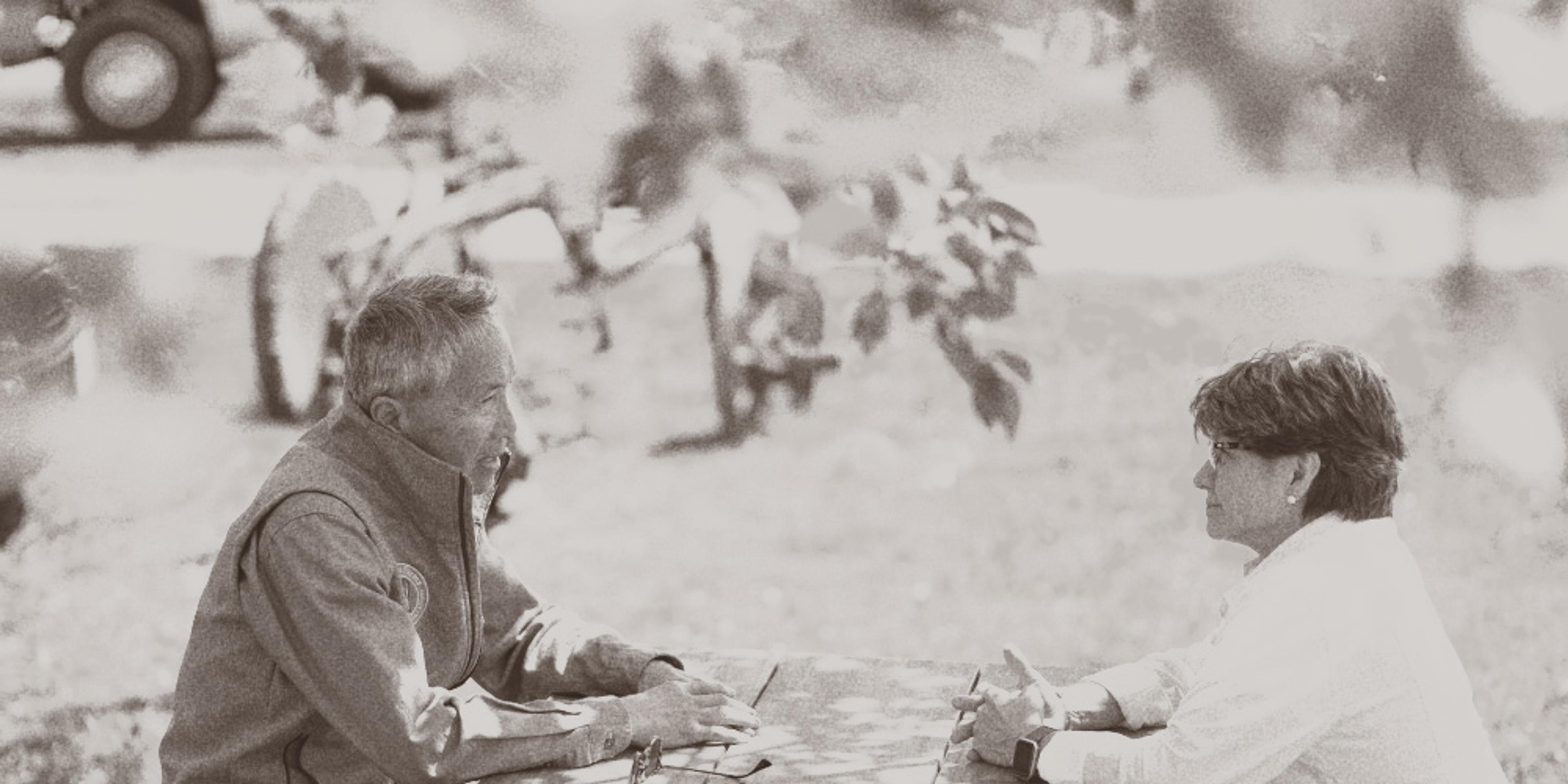 NY FarmNet family consultant Becky Wiseman (left) meets with client Fred Lee (right) of Sang Lee Farms on Long Island to provide mental health support.