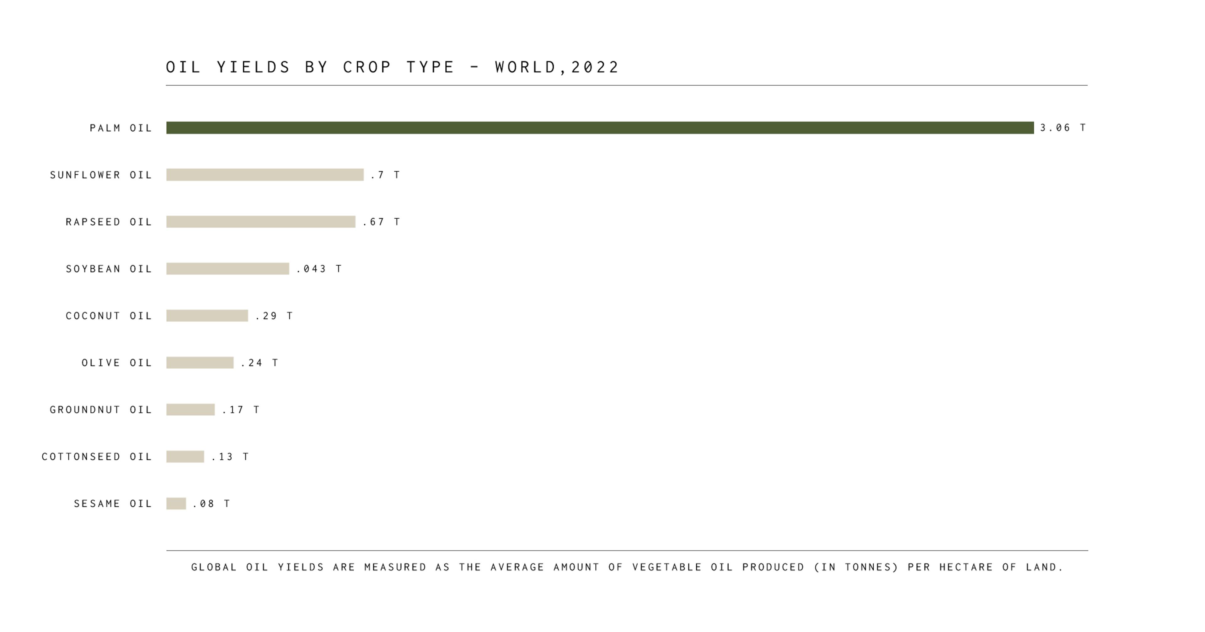 One of the reasons for the popularity of palm is that in these rare tropical ecosystems, the plant yields an extraordinary 3.06 tonnes of oil per hectare, making it more than four times as prolific as sunflower oil and more than seven times as prolific as soybean oil. And that’s before you get into its physical qualities that are so useful in food science and cosmetics, including spreadability, melting behavior, and texture.