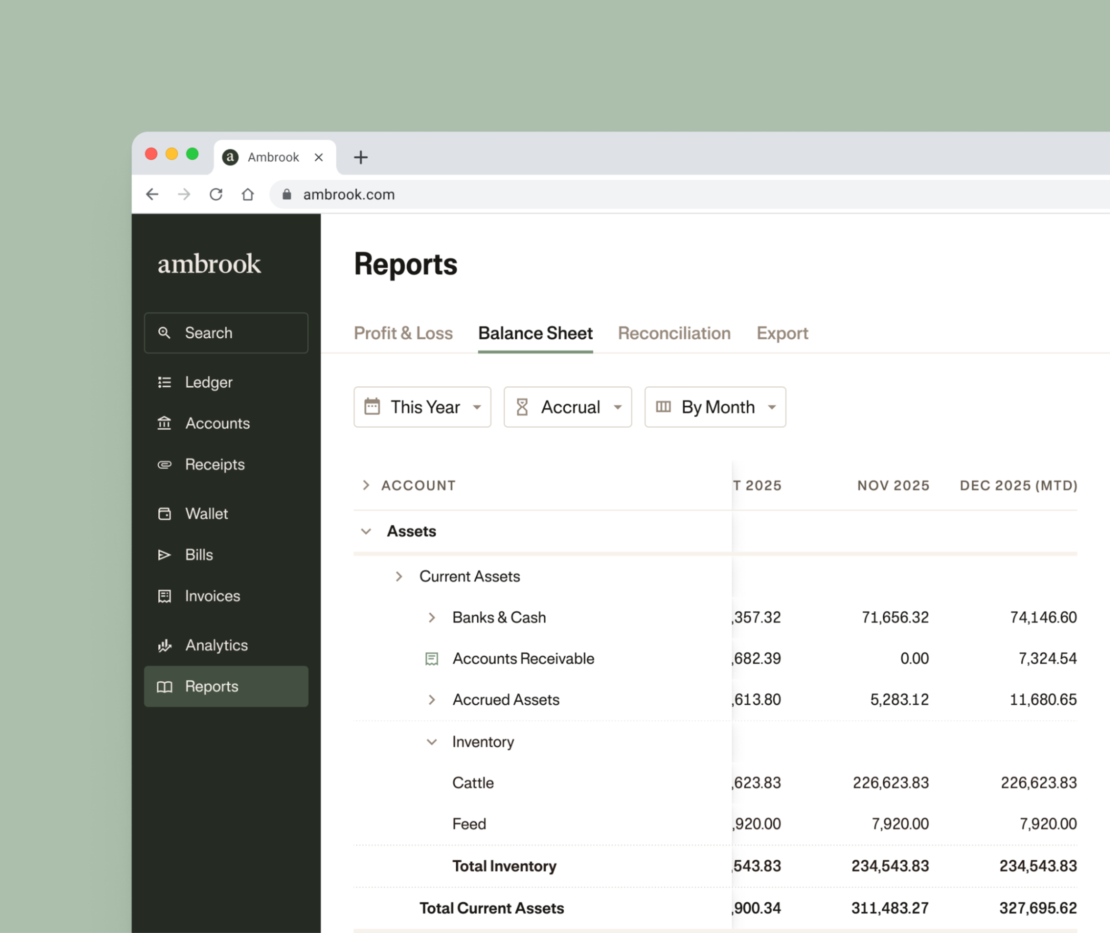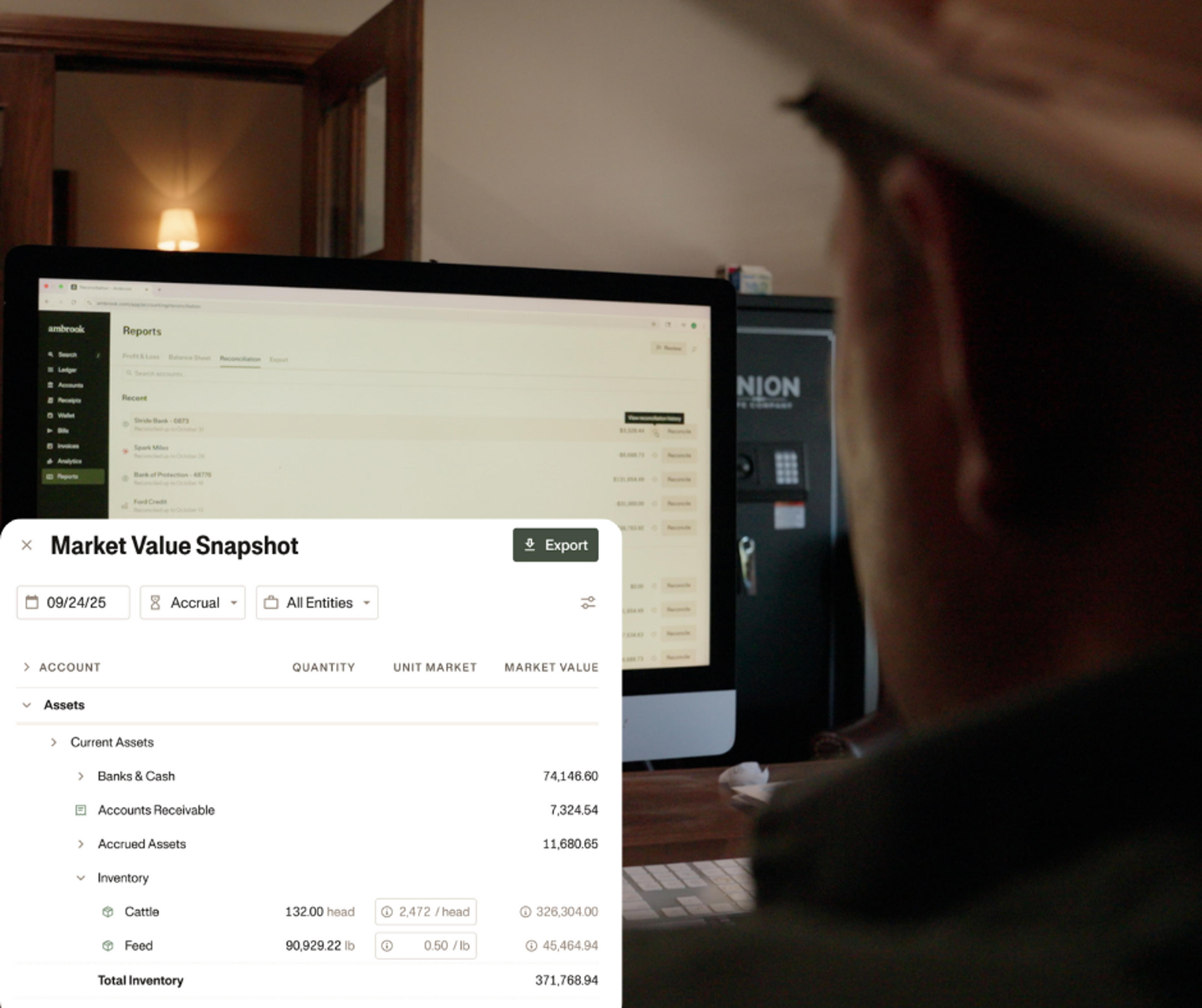 Ambrook Inventory ties everything you raise, buy, and sell to your books — so your financials show your true value, true costs, and what your operation is really worth today.