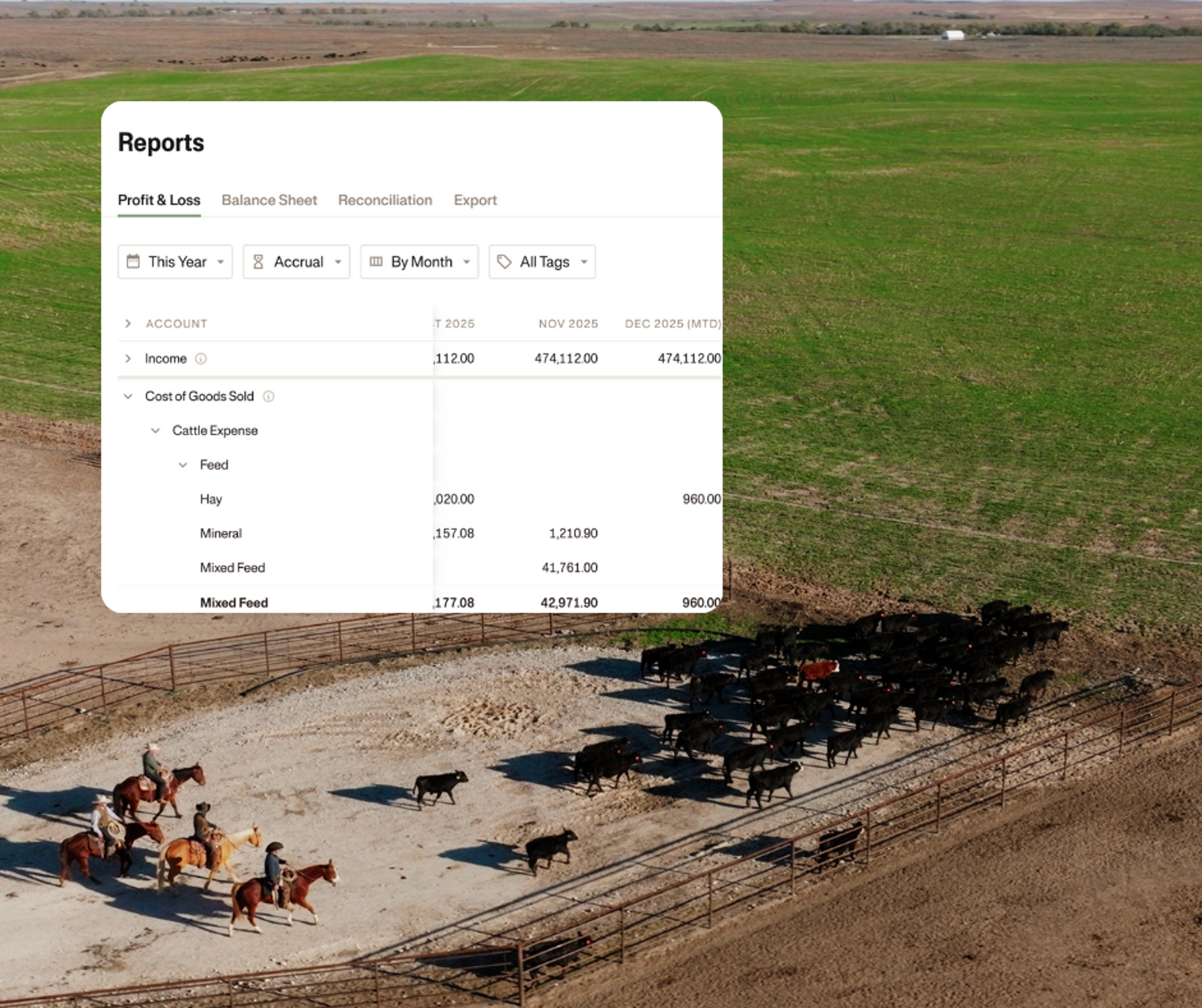 Generic platforms like QuickBooks assume you purchase everything. They can’t represent goods you raise yourself, like cattle or hay. Ambrook is built for producers, so cattle, feed, and crops appear on your balance sheet and COGS calculates automatically.