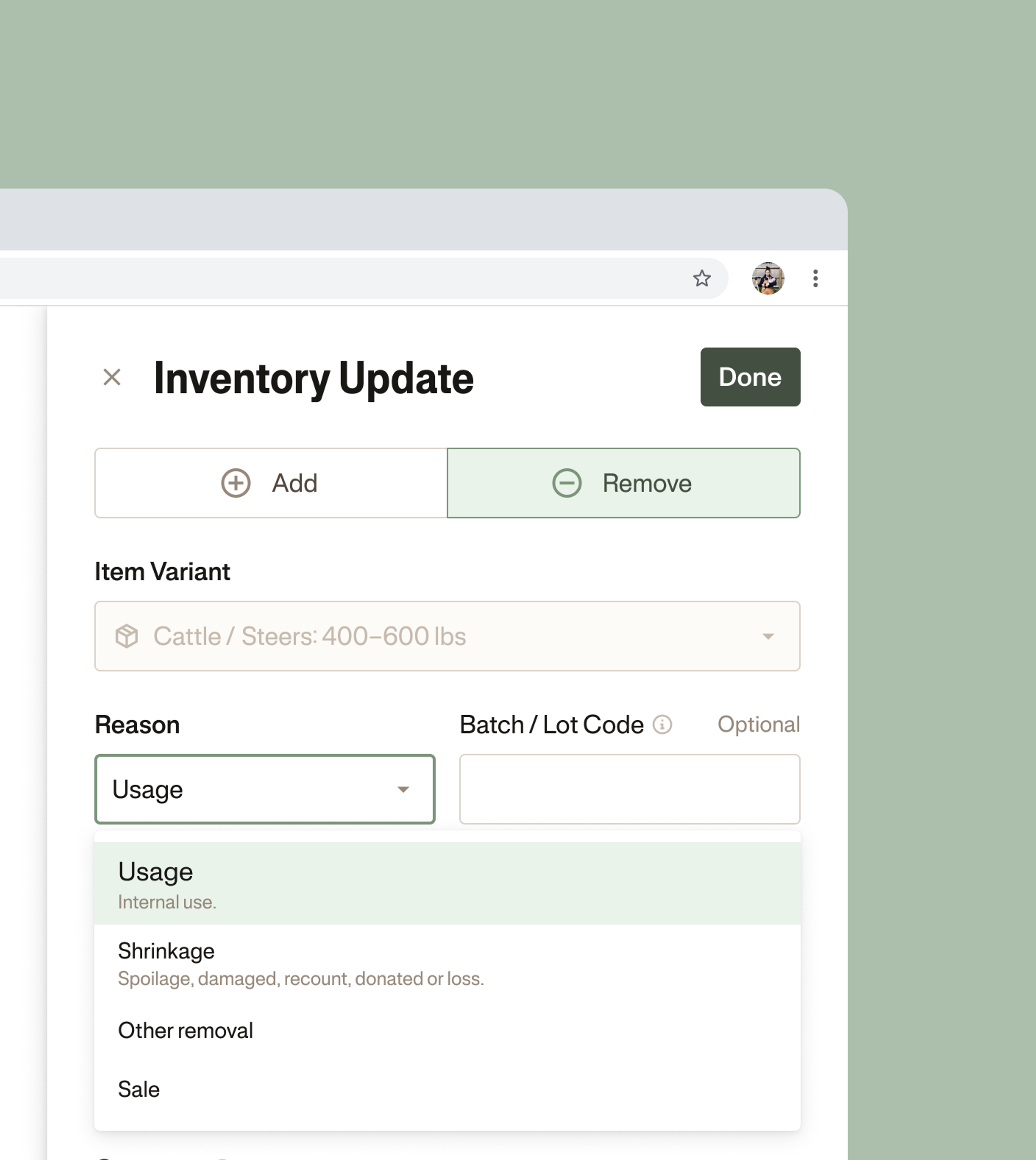 Invoices, bills, and transactions update quantities and costs. You can also log births, harvests, shrink, and usage in real time. Nothing gets missed. Know what needs reordering.