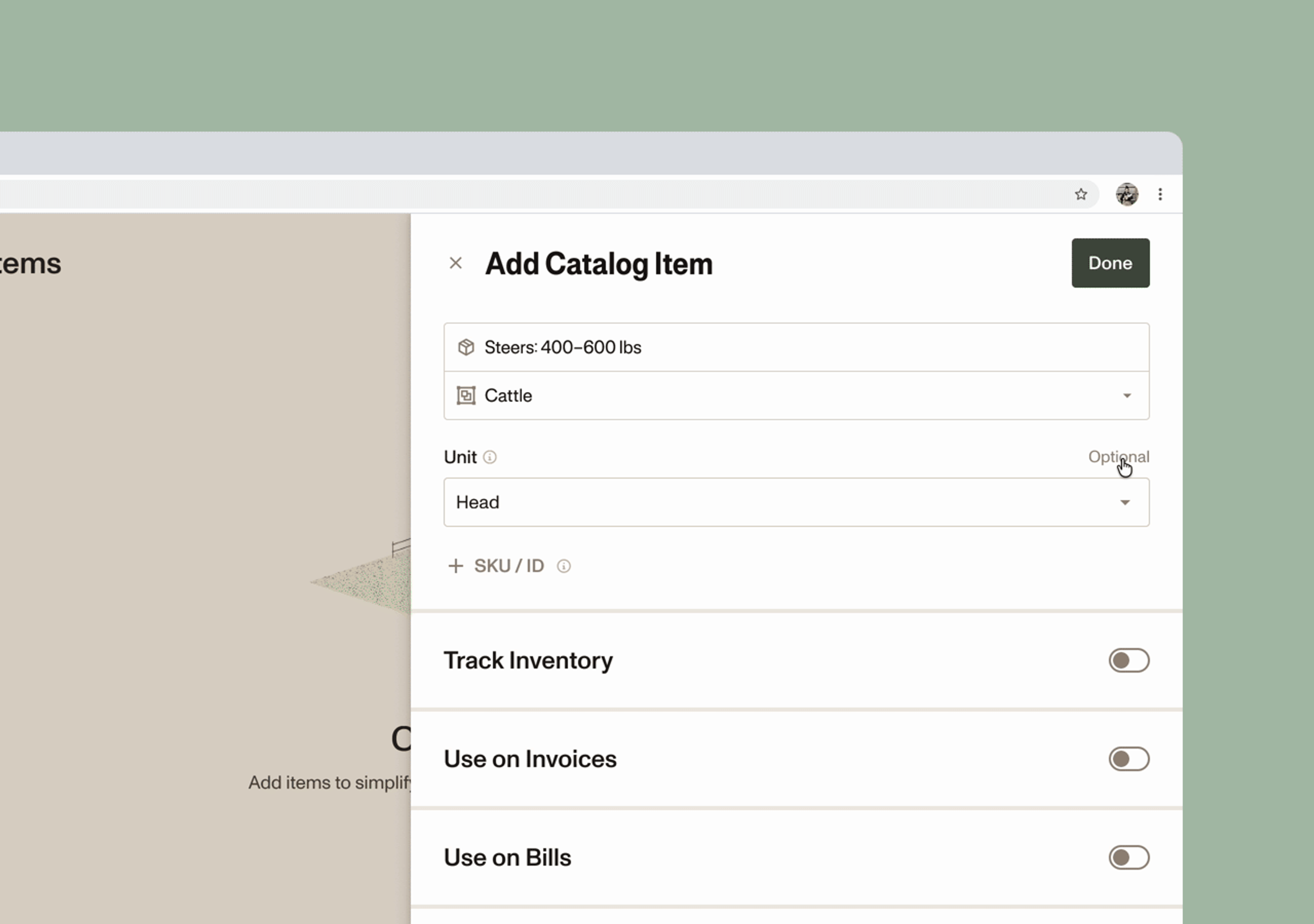 Add what you raise, grow, buy, or sell. For items you produce like calves or hay, turn on Track Production Value so Ambrook treats them as assets from your operation—not purchases.