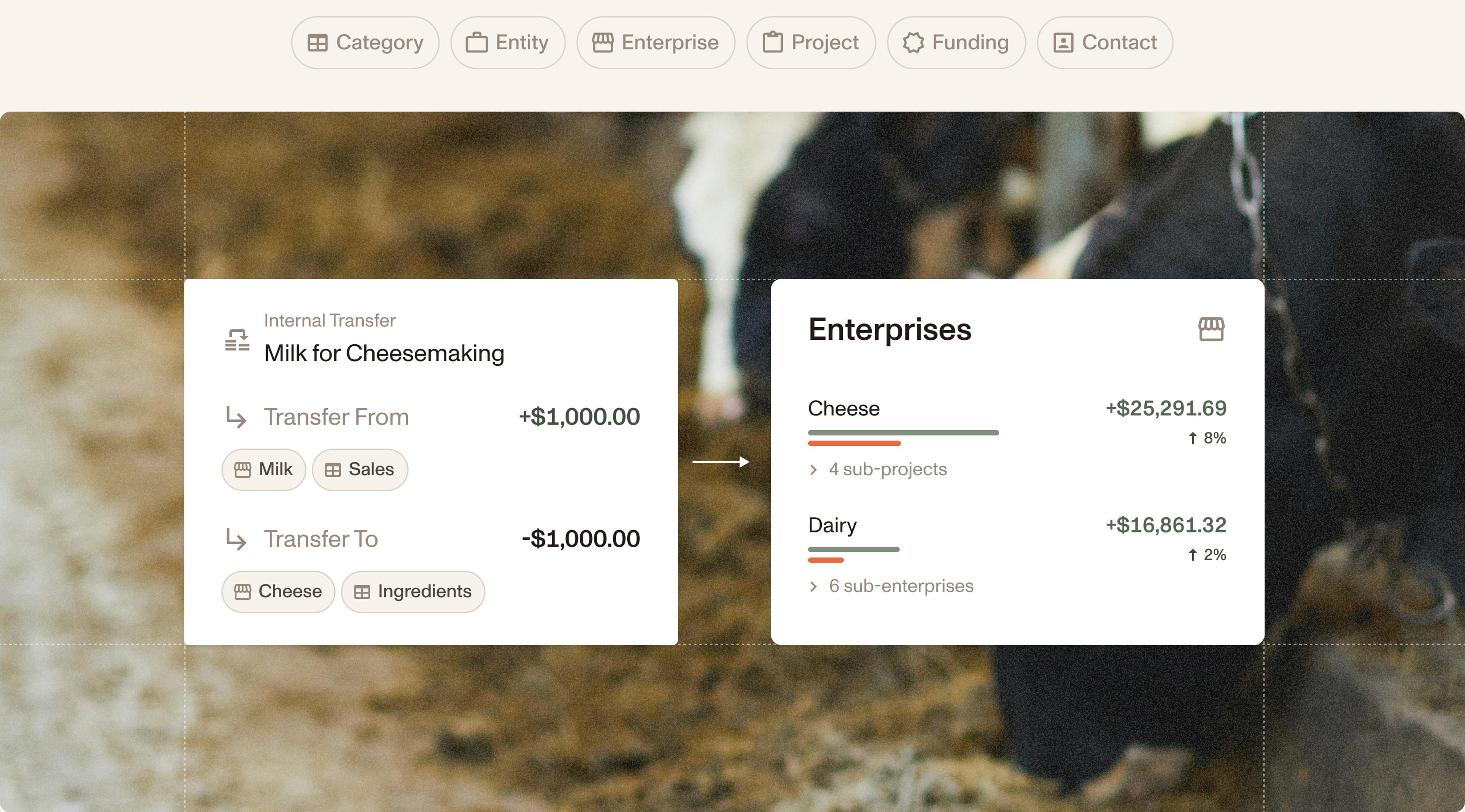Track the flow of ingredients between enterprises, like milk sold to your cheesemaking operation, to understand true unit economics. Compare profitability across your value chain to optimize pricing, resourcing allocation, and production decisions.