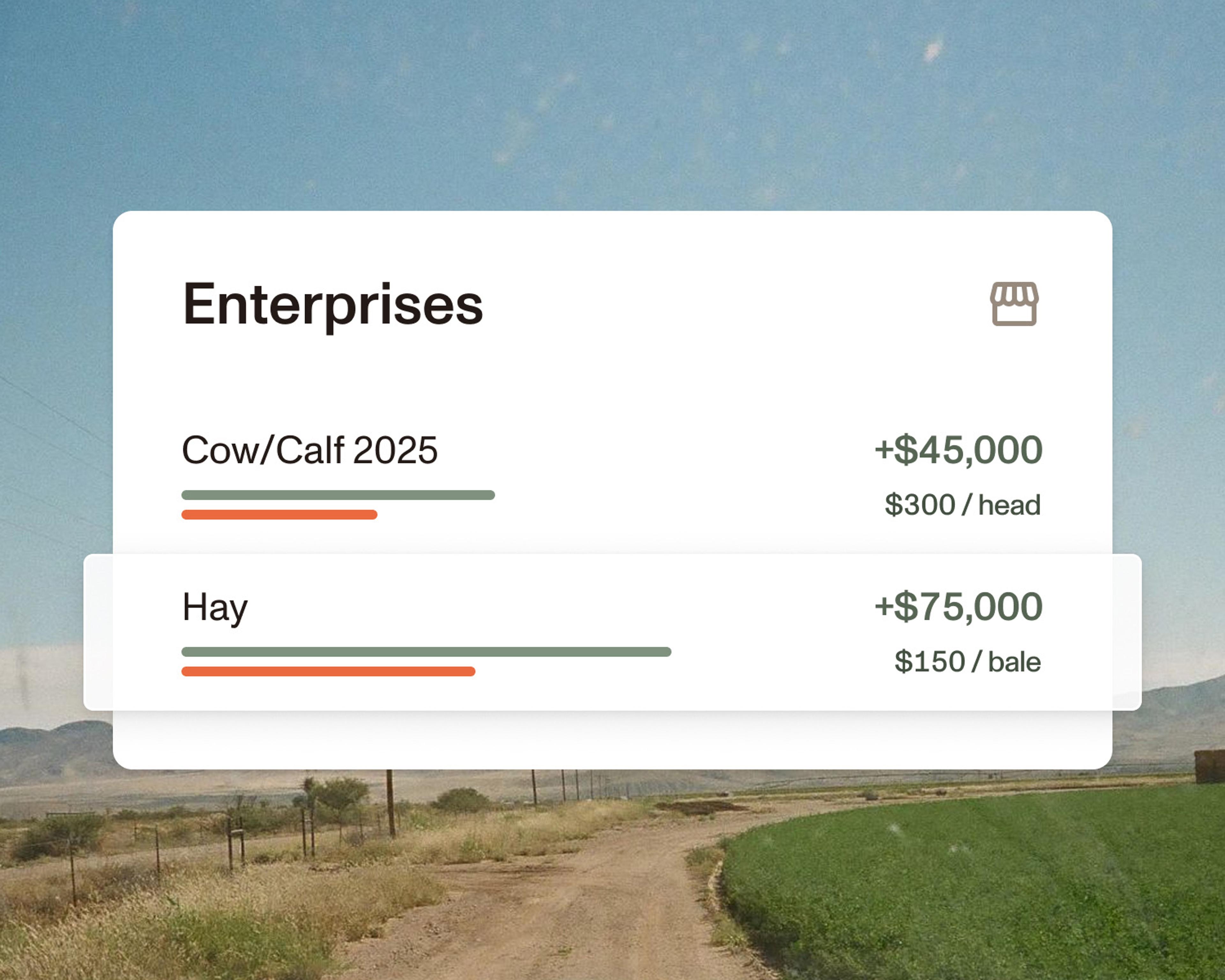 Track profitability by enterprise (cow-calf, stockers, hay, custom grazing) with individual P&Ls and cost of production per head/acre.