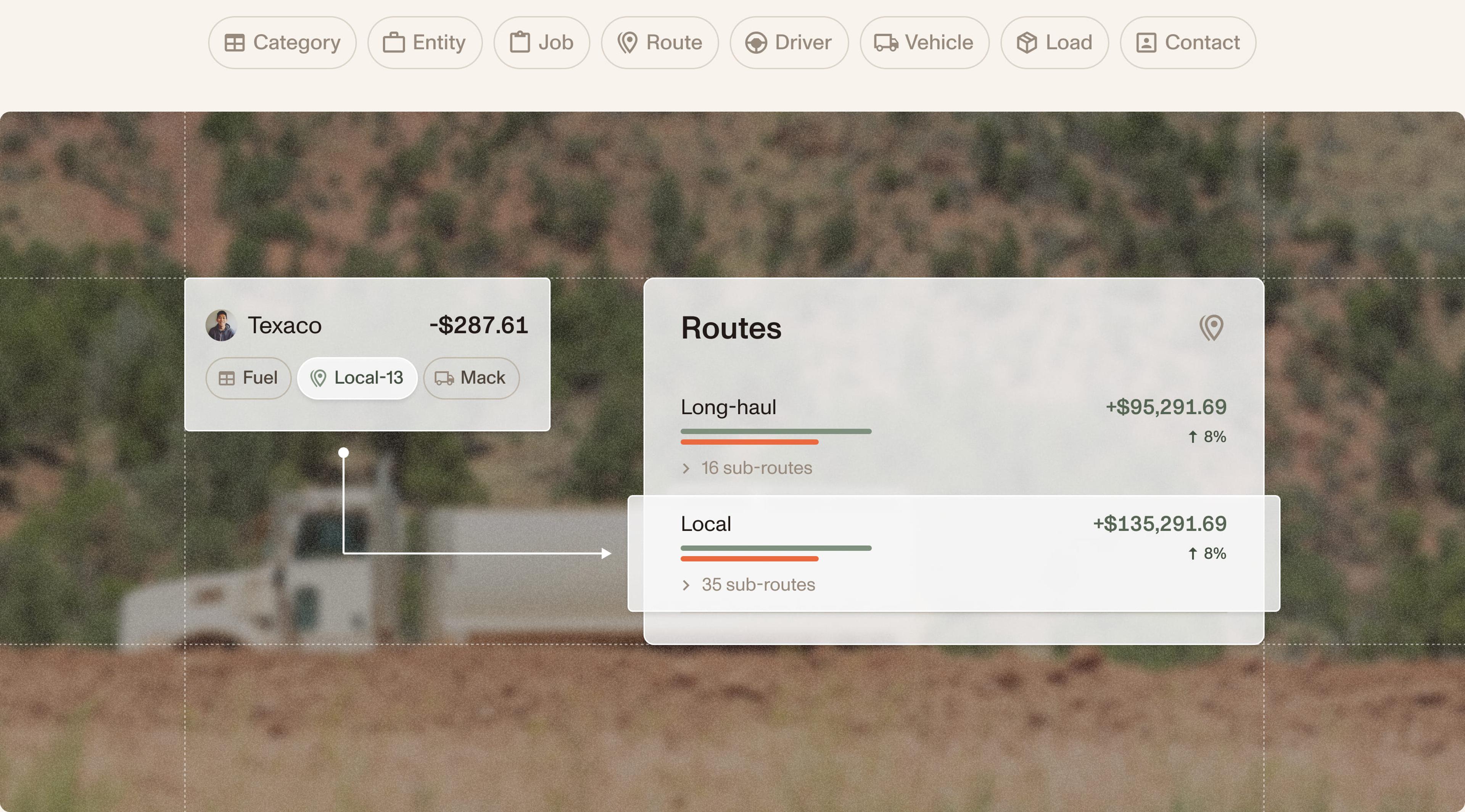 Map Ambrook to your business. Ambrook’s unique flexible tagging system gives ERP‑level customization without the complexity. Track job, load, driver, and more on top of categorizations for tax season.
