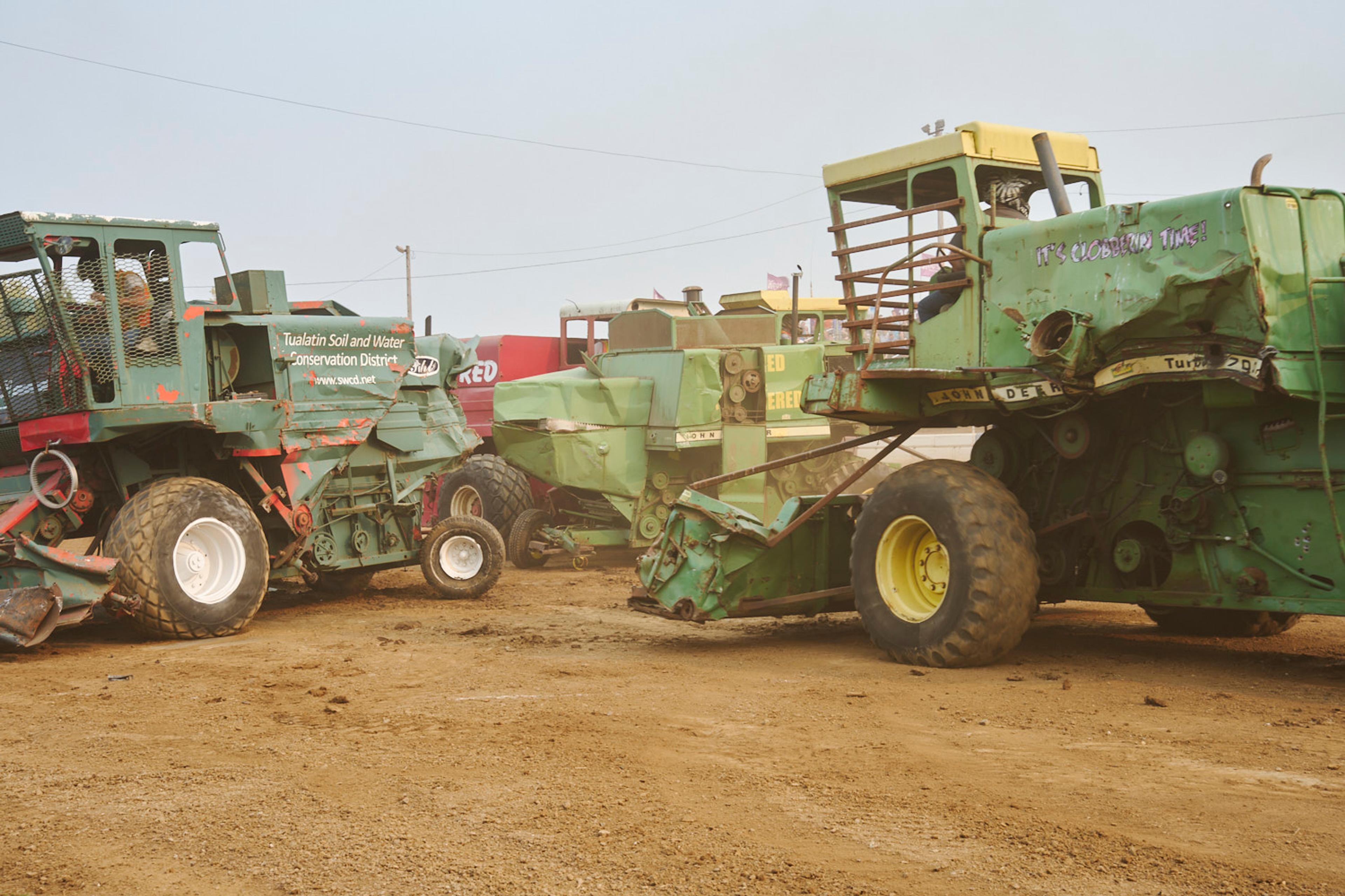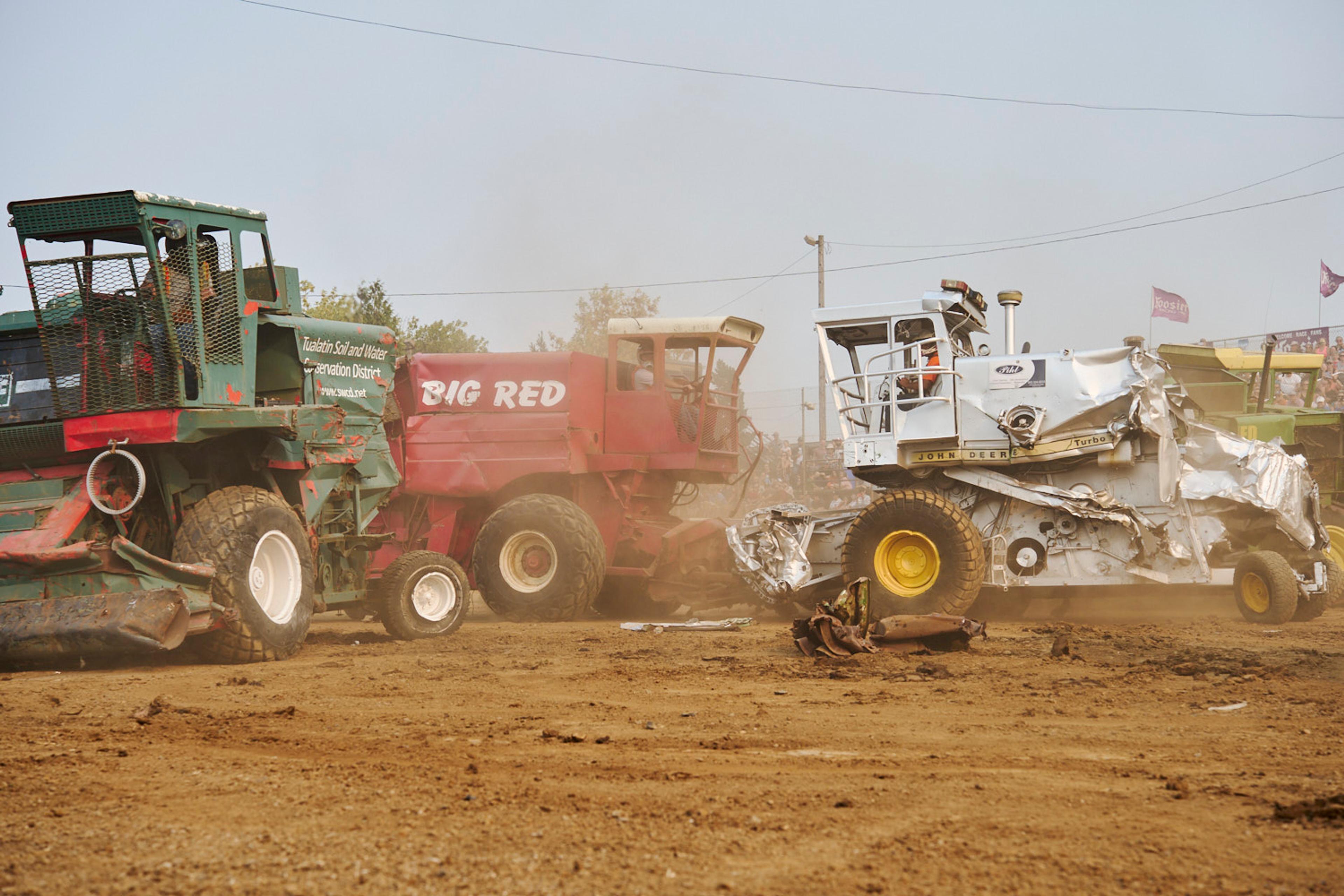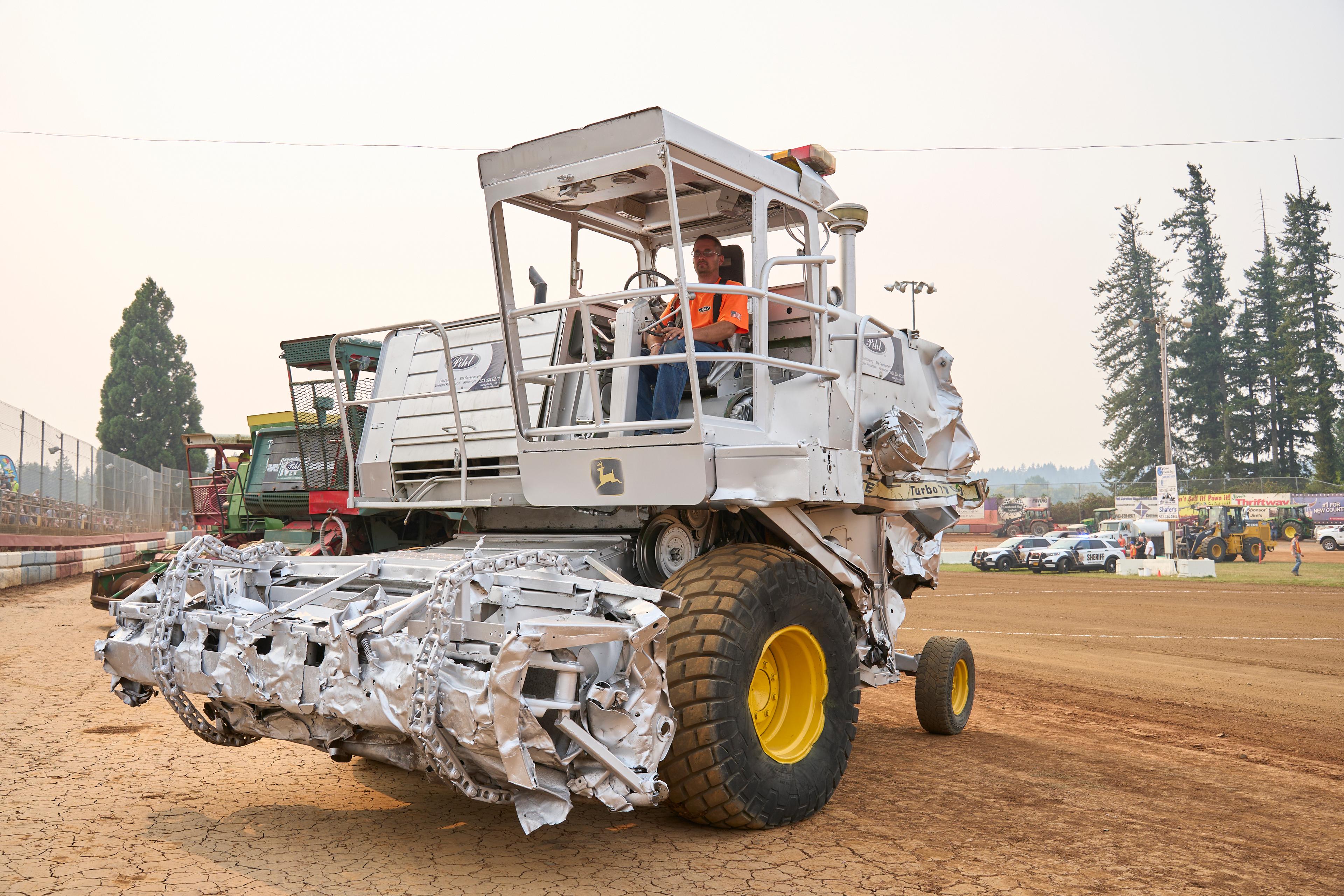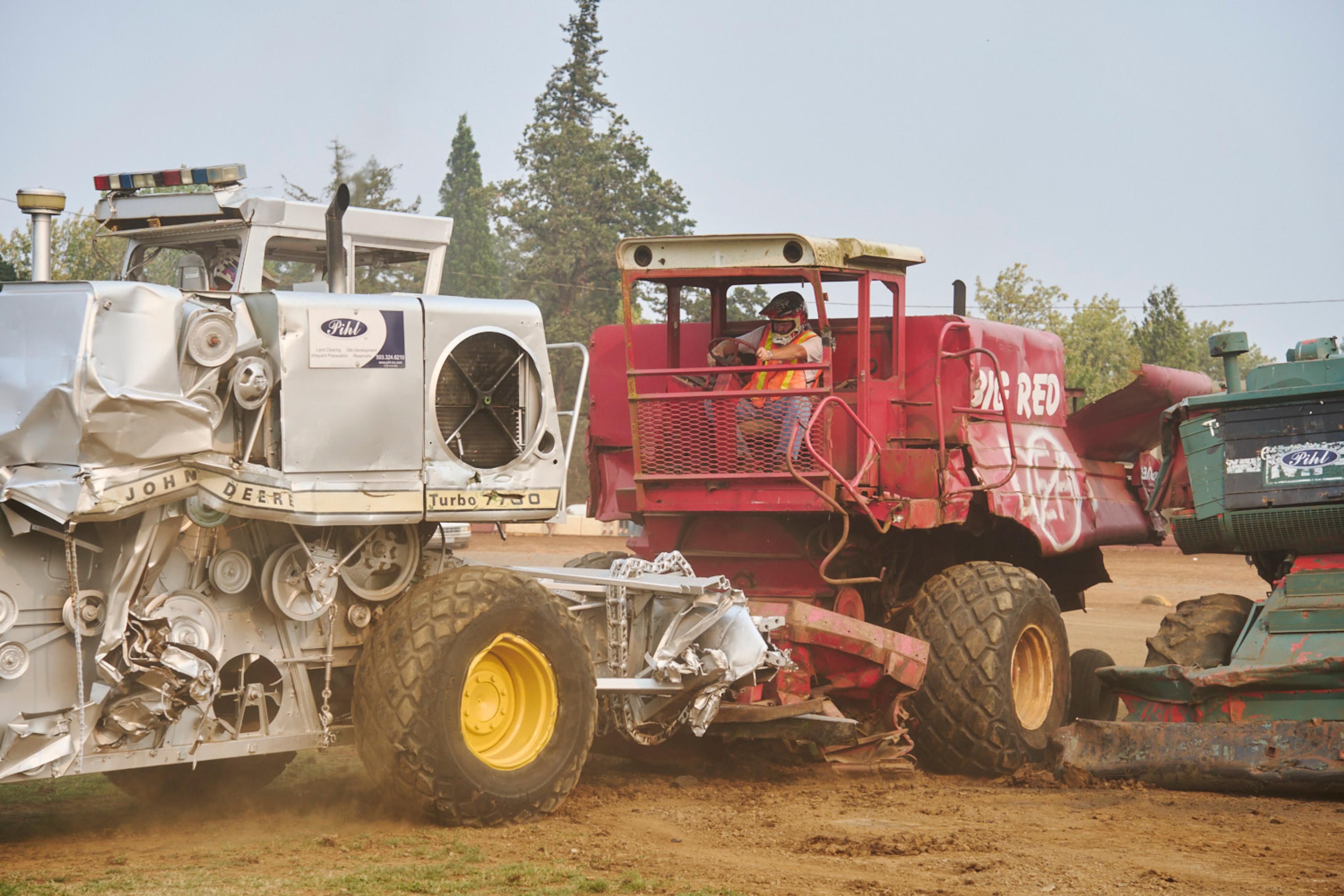 The signature event in tiny Banks, Oregon, is a demolition derby with a twist — instead of cars, drivers go head to head with massive farm equipment.