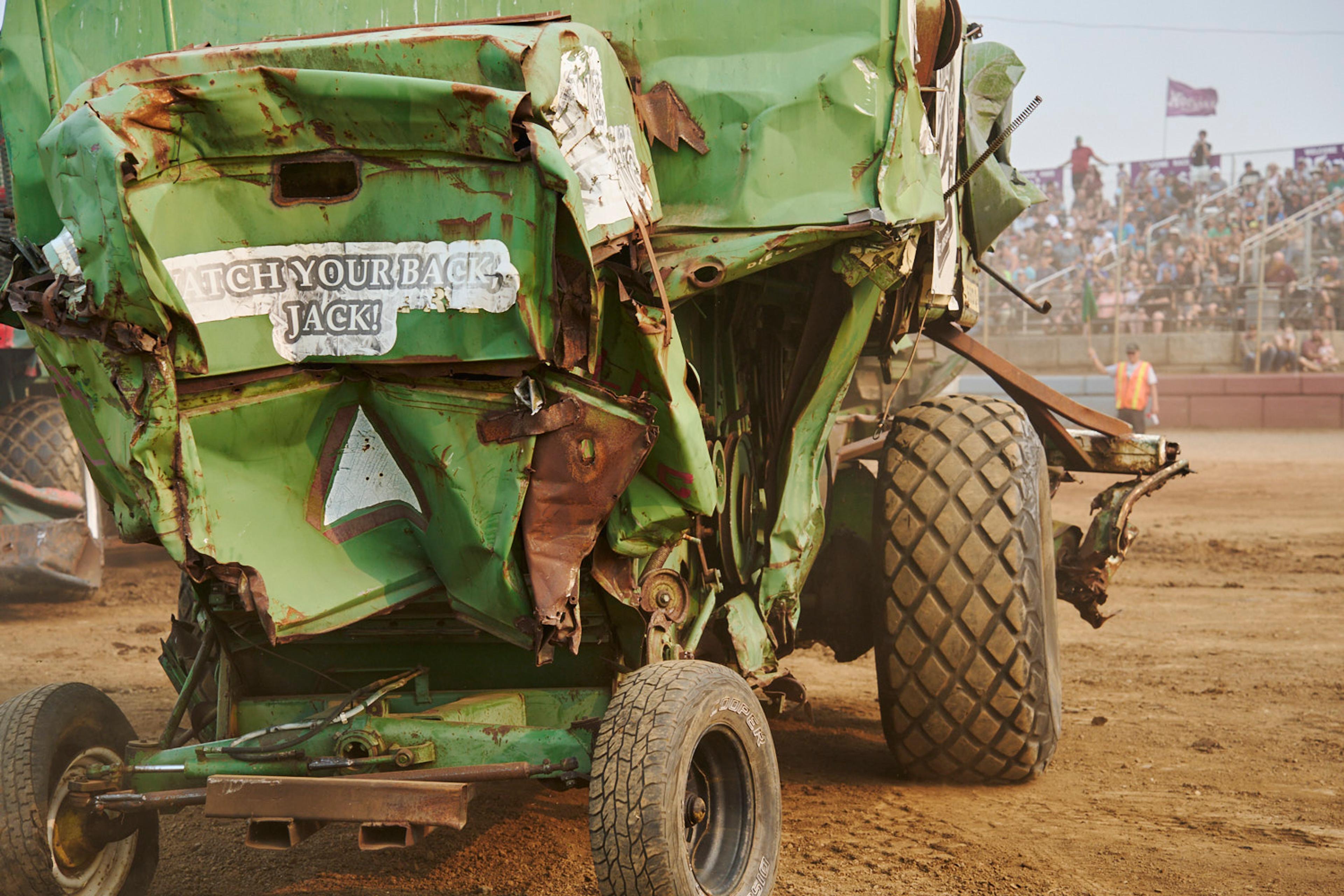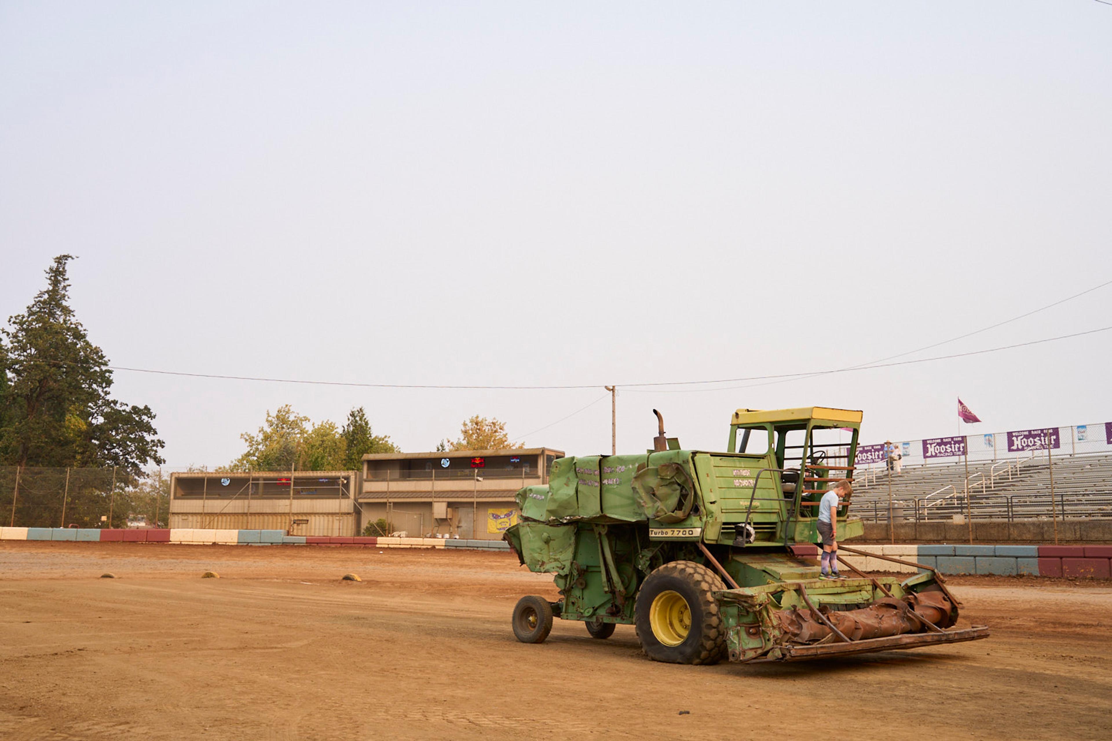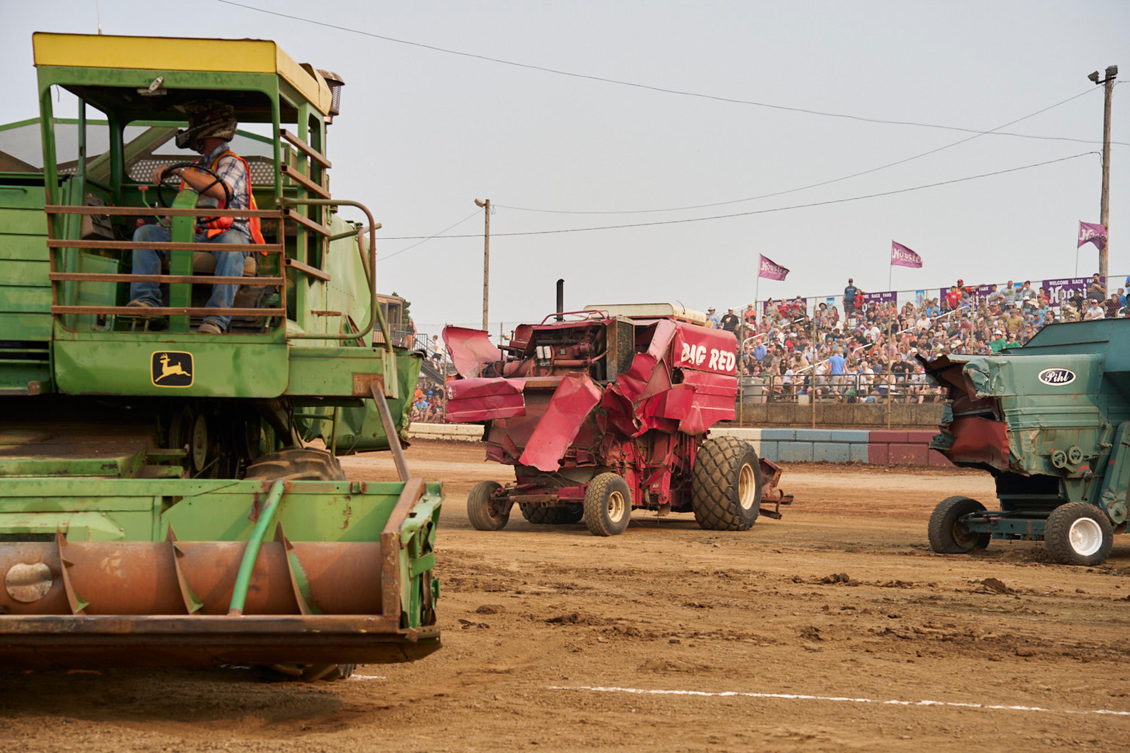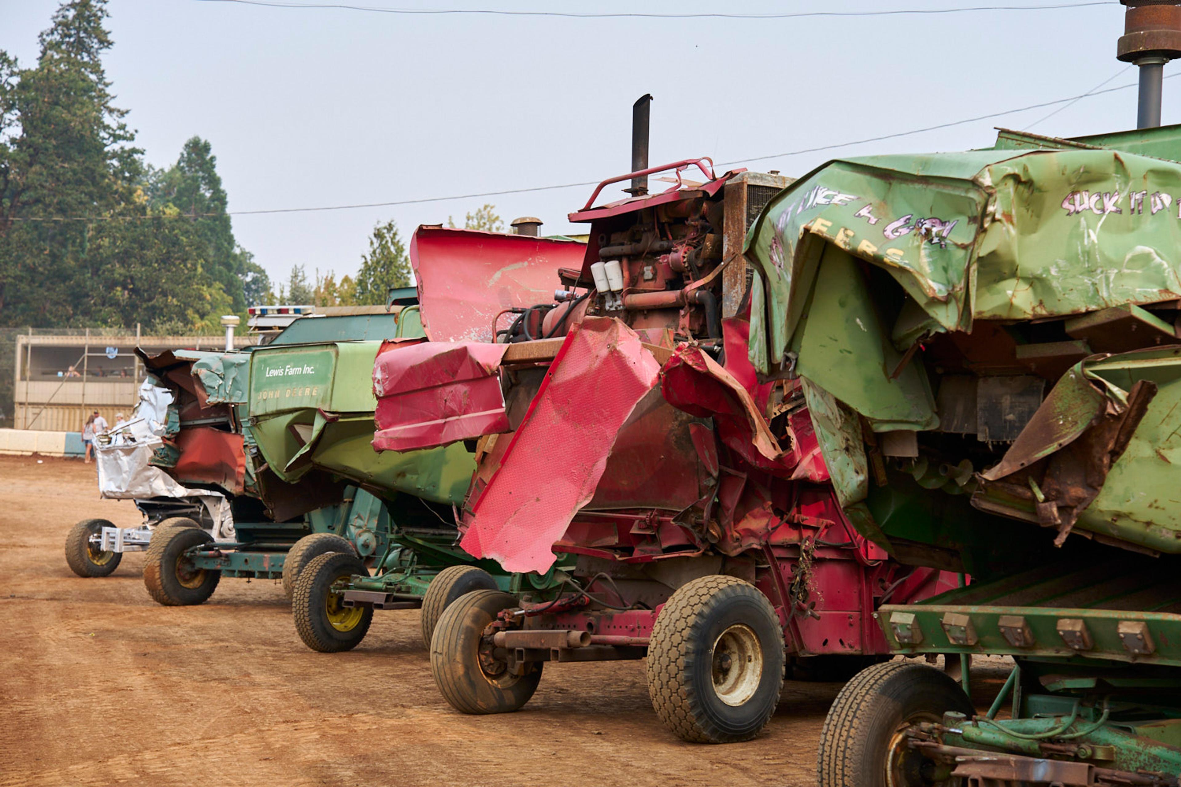The signature event in tiny Banks, Oregon, is a demolition derby with a twist — instead of cars, drivers go head to head with massive farm equipment.