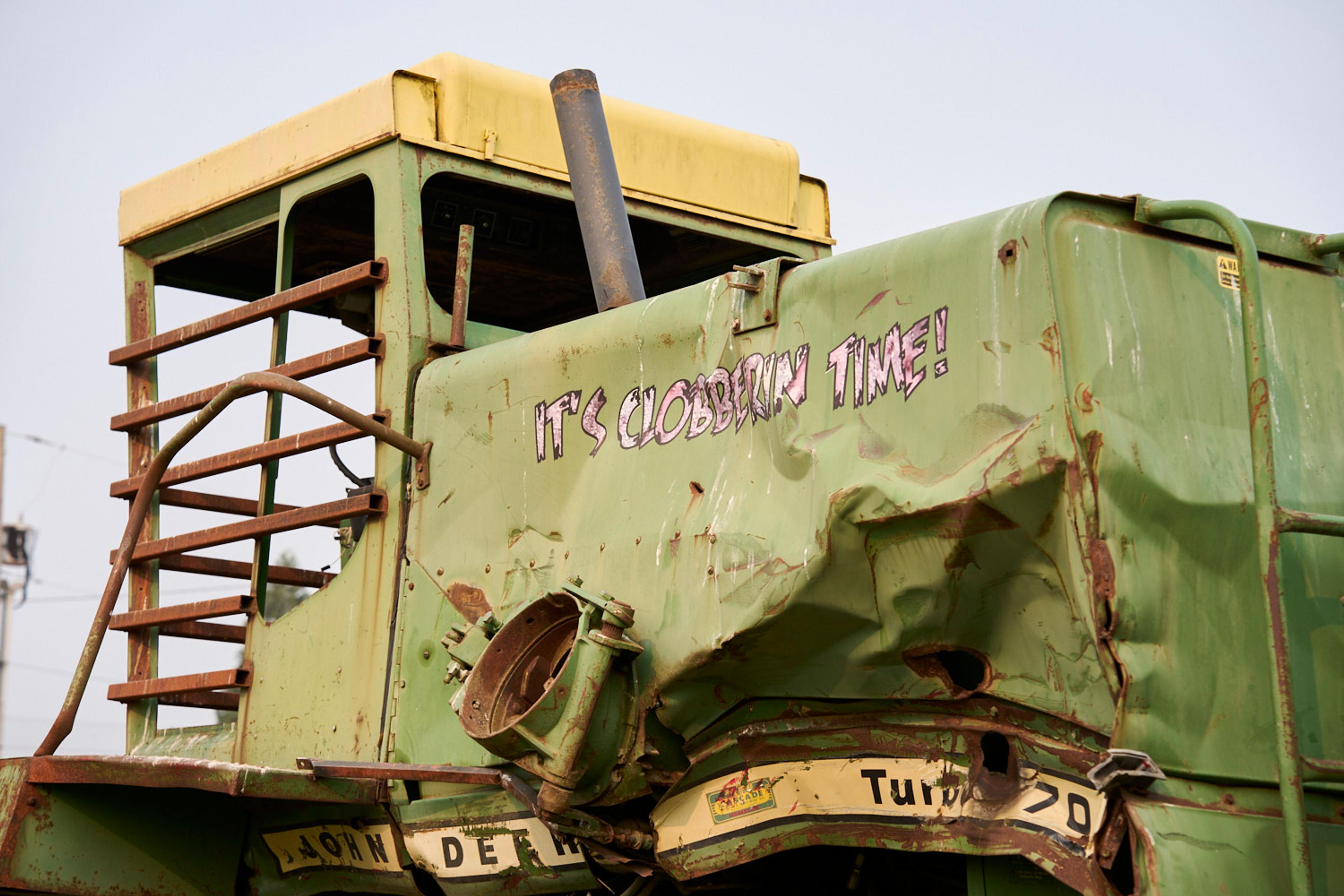 Combines can get pretty mangled, and the process of piecing them back together can be Frankenstein-esque. Lewis said he’s able to source spare parts from other combines to get his working each year. “The derby’s been going on long enough that you can just call around and ask for parts,” he said. If you lose an engine or transmission, it’s done. “You don’t want to spend a lot of money on these. You fix them as best you can — do a lot of welding.” If you can salvage enough parts, you’ll be good for next year.